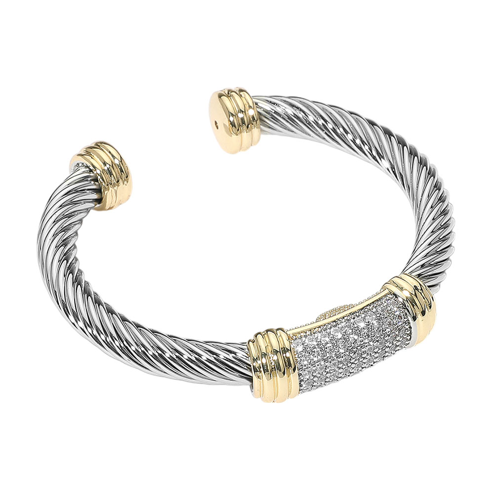 • Elevate your style with this sophisticated two-tone cuff bracelet, featuring a twisted stainless steel cable design, gold-tone end caps, and a pavĂ©-set cubic zirconia centerpiece. A timeless accessory that blends bold elegance with modern shine—perfect for formal or everyday wear.