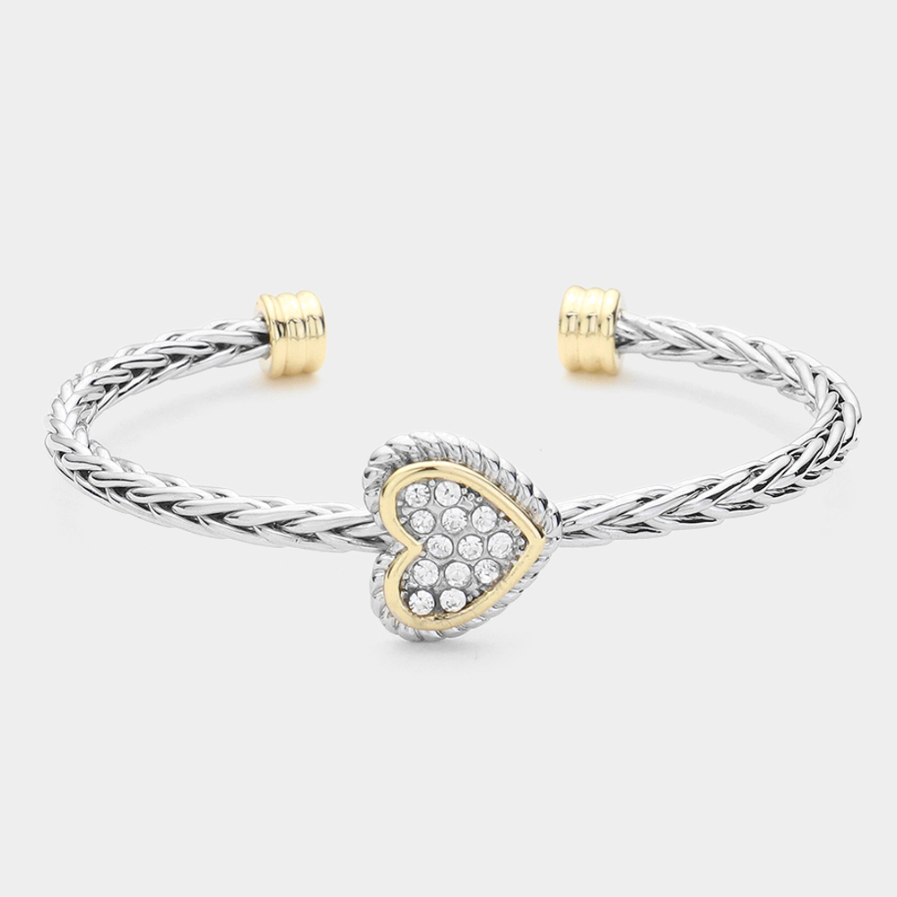 Stone Paved Heart Accented Braided Metal Cuff Bracelet