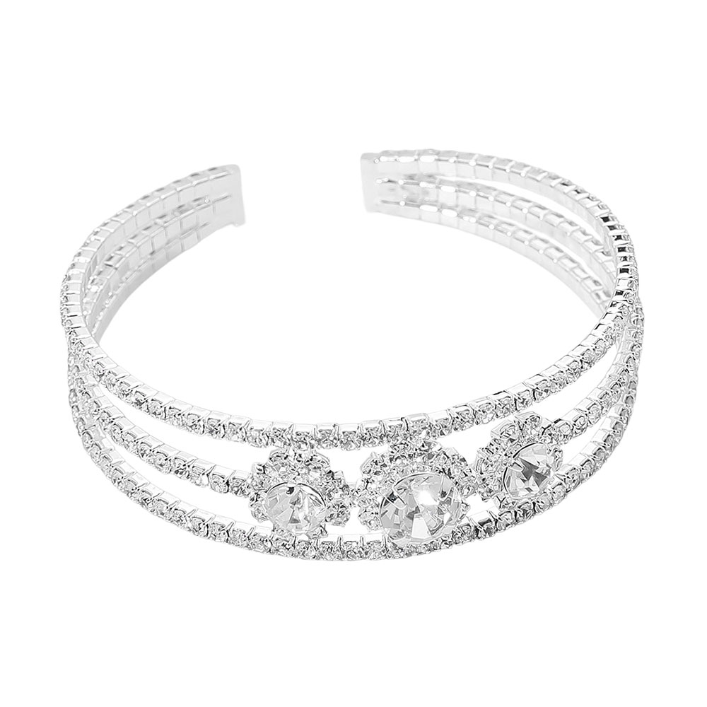 Details • Size : 0.6" H, 2.4" D • Cuff • This triple row crystal cuff bracelet exudes timeless glamour with its intricate rows of sparkling stones and refined open design. Perfect for special occasions or evening wear, it adds a radiant touch of sophistication, capturing the light beautifully for a luxurious and polished finish. • CZ Cubic Zirconia • Lead and Nickel Compliant