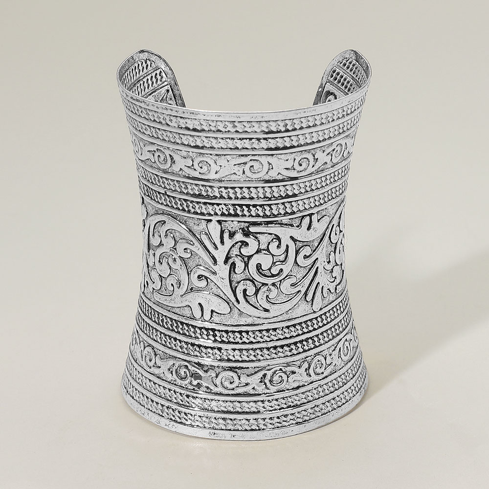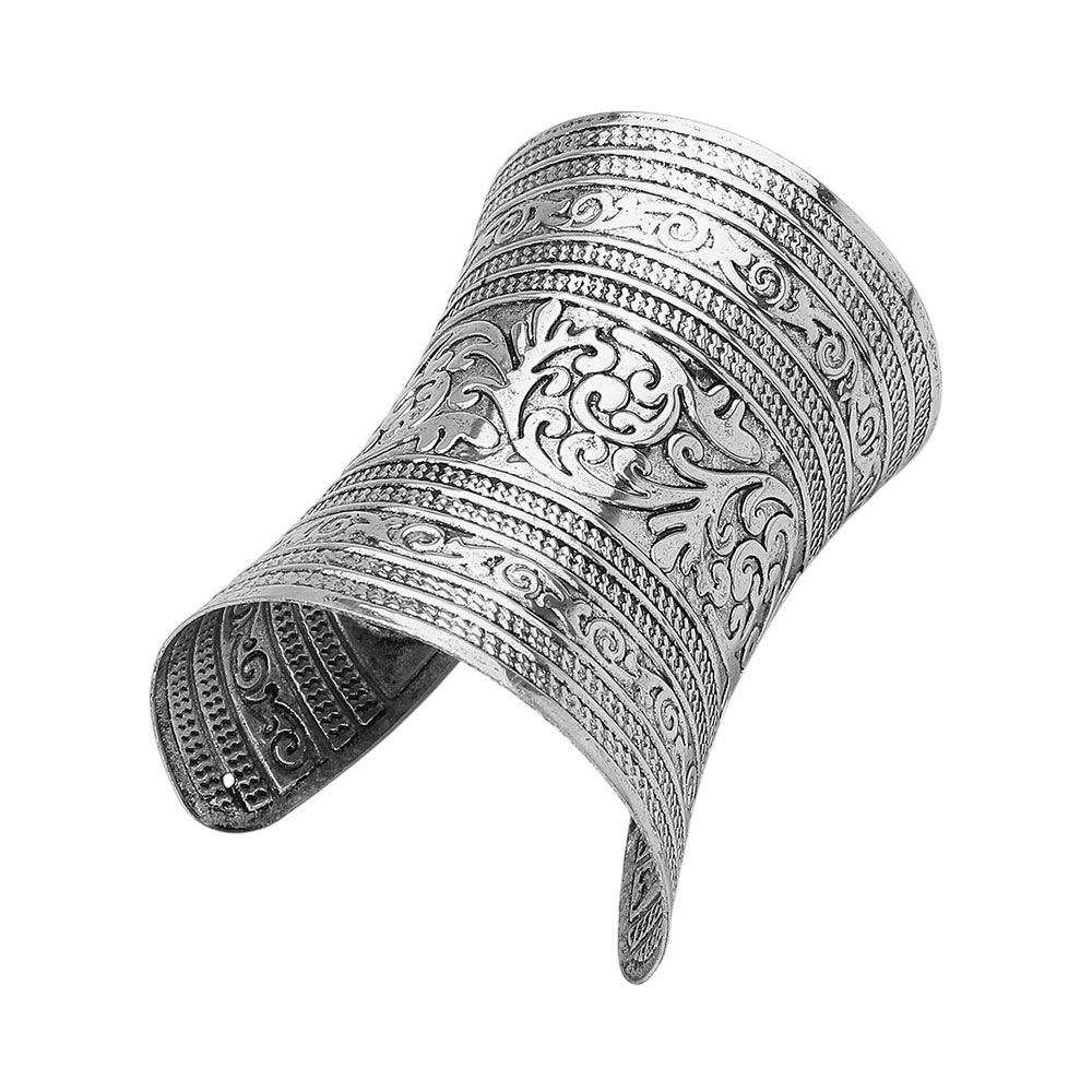 Details • Size : 3.75" H, 2.75" D • Cuff • Statement wide cuff bracelet with intricate engraved floral scroll patterns and vintage-inspired detailing. The bold curved design adds timeless sophistication to any outfit, perfect for elevating casual wear or completing elegant evening looks. • Lead and Nickel Compliant