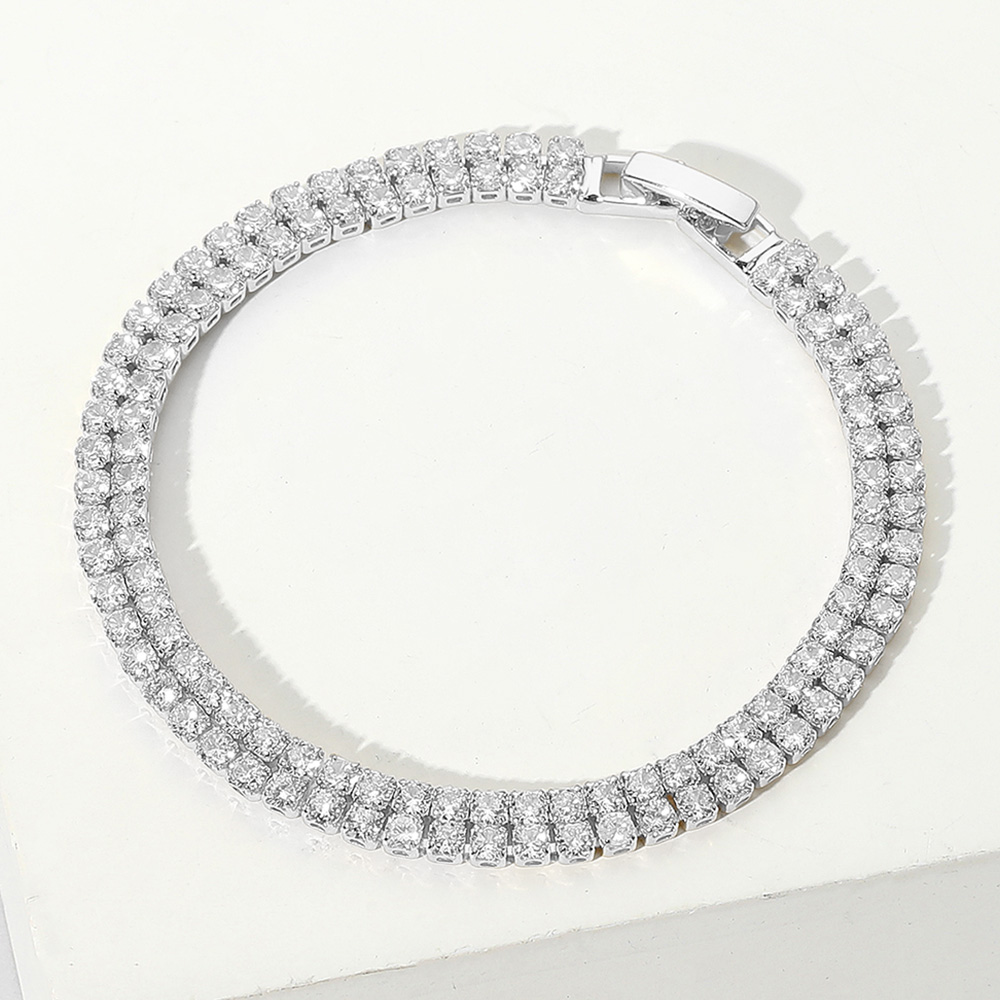 Details • Size : 0.2" H, 7" + 0.25" L • Fold Over Closure • Dazzle with timeless brilliance in this double row tennis bracelet adorned with round-cut CZ stones. An elegant piece that adds luxurious sparkle to evening attire or enhances any outfit with classic radiance. • Lead and Nickel Compliant • CZ Cubic Zirconia