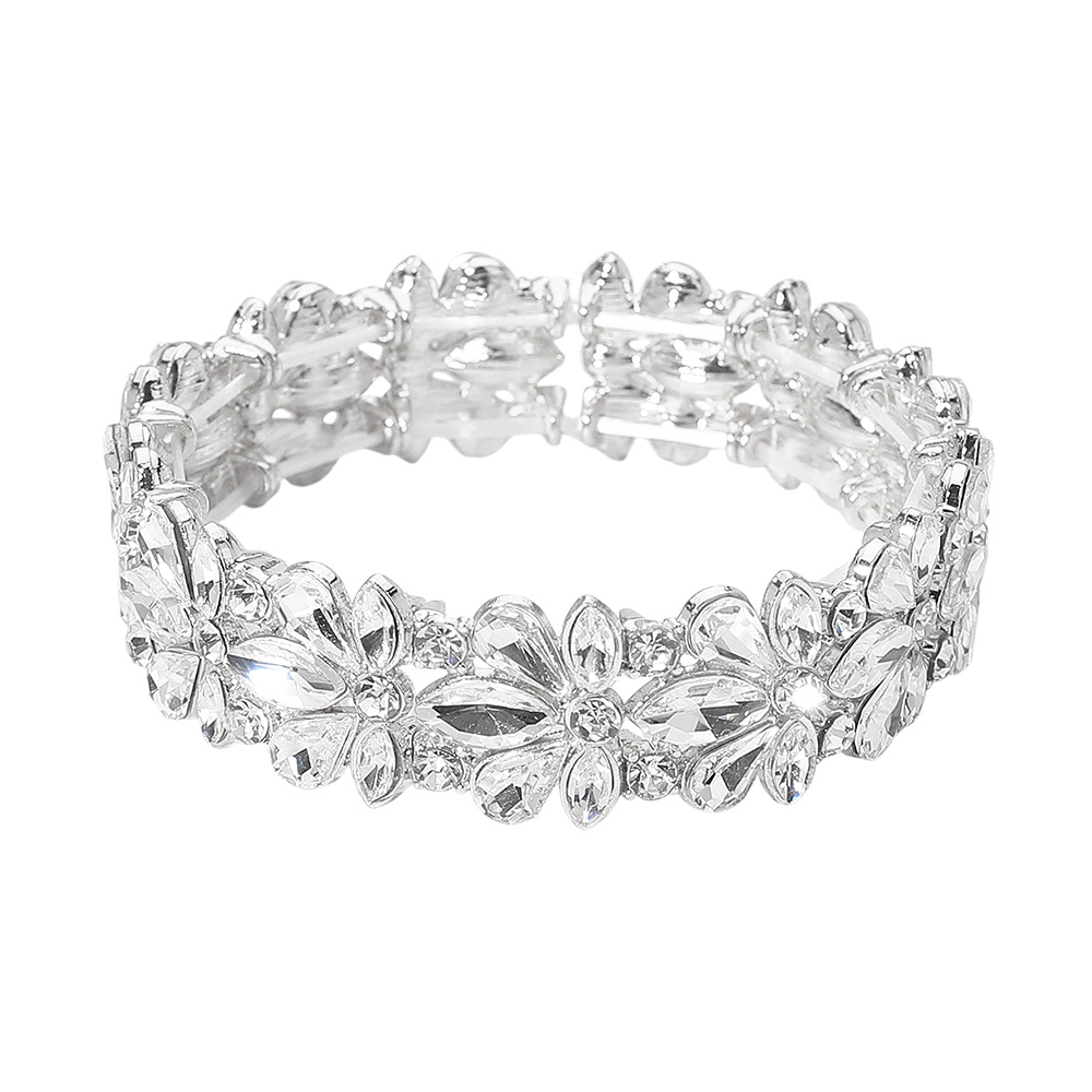 • An elegant stretch bracelet featuring layered floral detailing with a radiant, eye-catching finish. Designed for comfortable slip-on wear, ideal for parties, weddings, formal events, and special occasions, delivering refined style and glamour to elevate any outfit.
