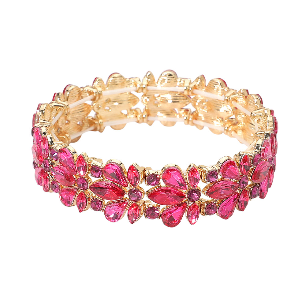 • An elegant stretch bracelet featuring layered floral detailing with a radiant, eye-catching finish. Designed for comfortable slip-on wear, ideal for parties, weddings, formal events, and special occasions, delivering refined style and glamour to elevate any outfit.