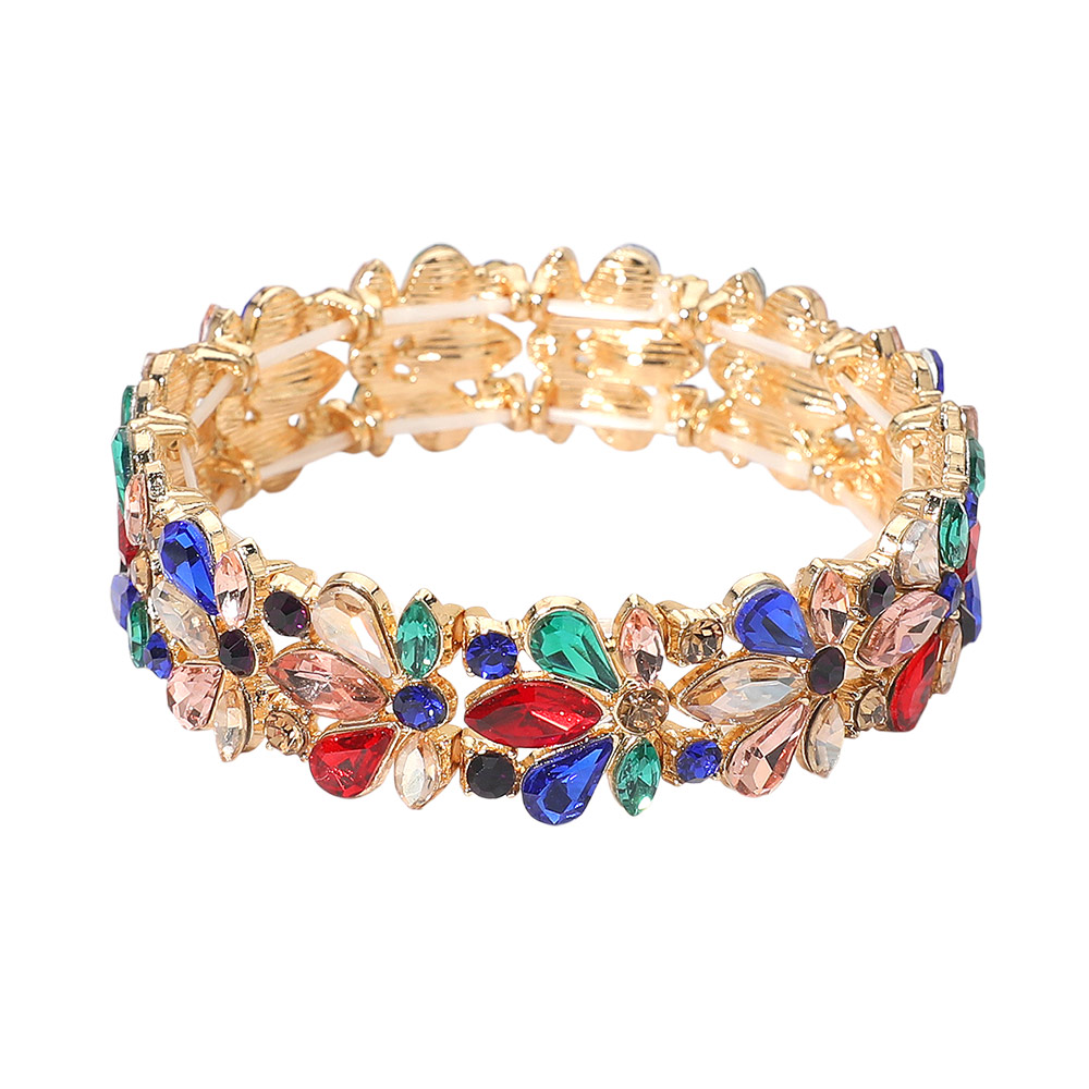 • An elegant stretch bracelet featuring layered floral detailing with a radiant, eye-catching finish. Designed for comfortable slip-on wear, ideal for parties, weddings, formal events, and special occasions, delivering refined style and glamour to elevate any outfit.