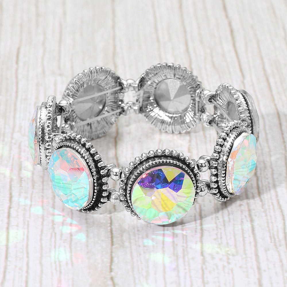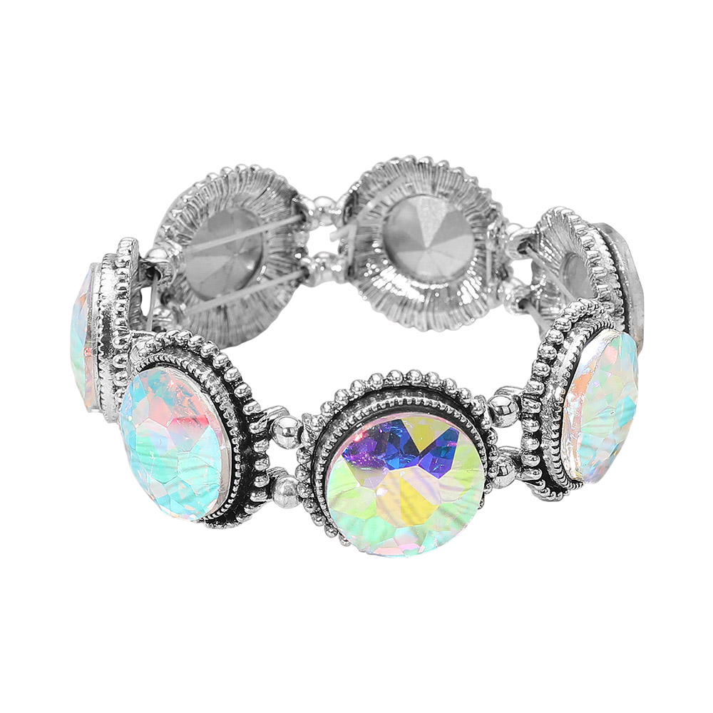 Details • Size : 1" H • Stretchable • Elevate your look with this iridescent round gem stretch bracelet featuring radiant faceted stones framed in intricate beaded settings. Designed to shimmer beautifully with every movement, this eye-catching piece adds a touch of glamour and versatility to both casual and elegant styles. • Lead and Nickel Compliant