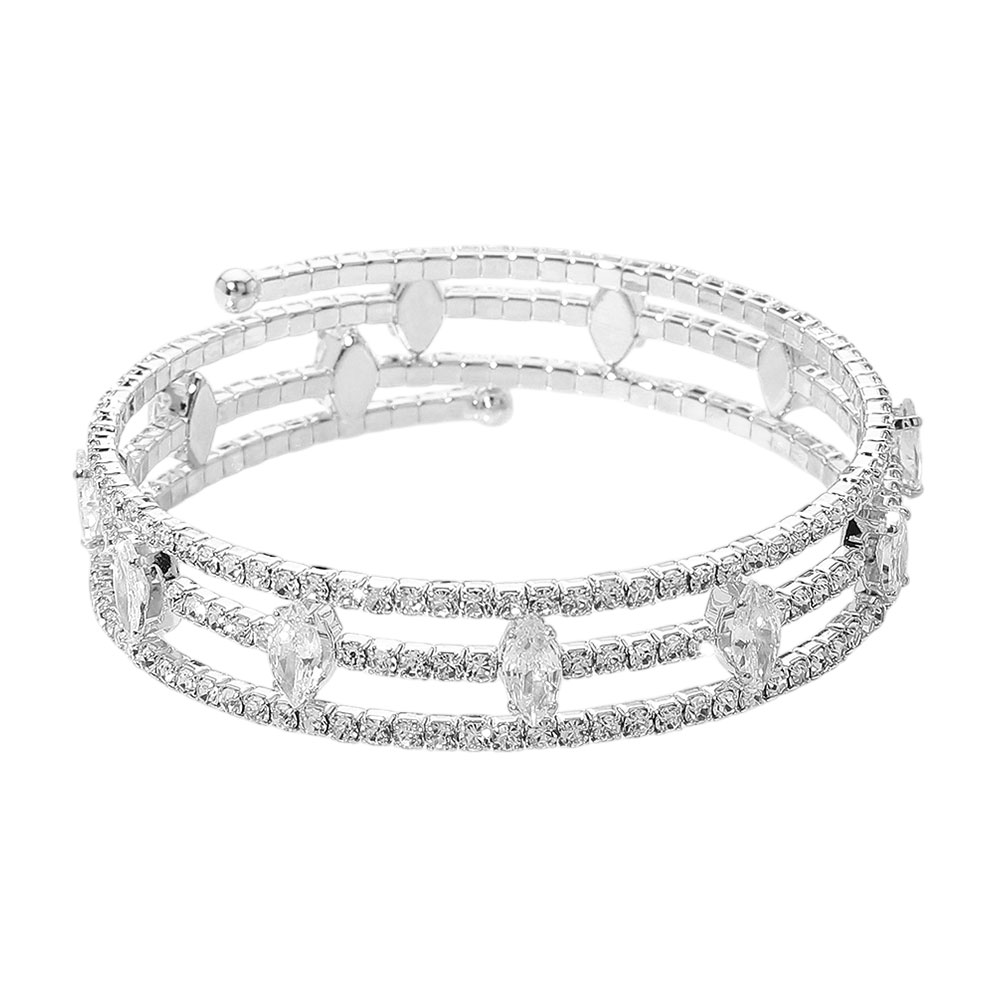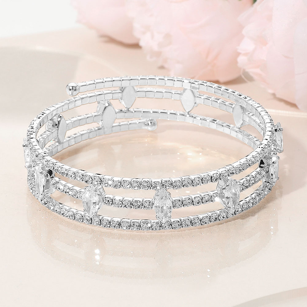 Details • Size : 0.75" H, 2.2" D • Adjustable • Dazzle with this triple row cuff bracelet featuring marquise-shaped rhinestones and shimmering pave crystals. A chic, adjustable design ideal for weddings, parties, or adding refined sparkle to formal looks. • CZ Cubic Zirconia • Lead and Nickel Compliant