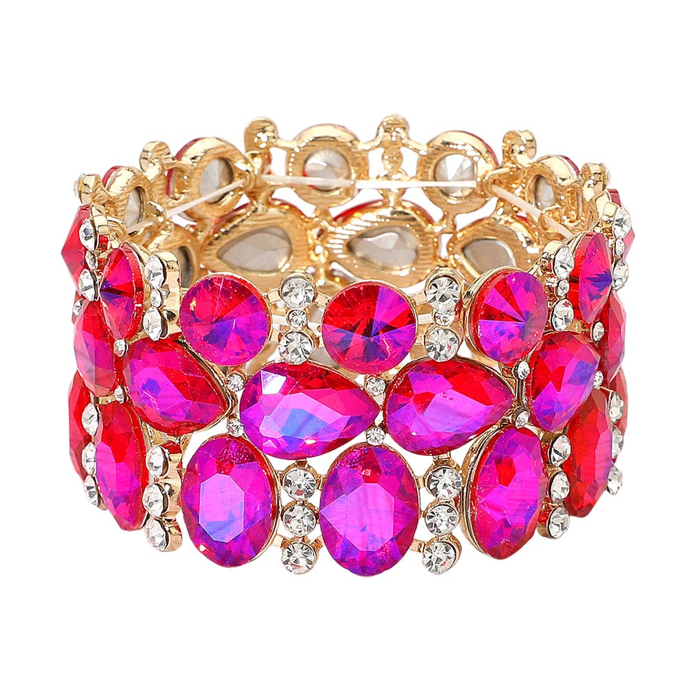 Details • Size : 1.6" H, 2.5" D • Stretchable • This elegant gemstone statement bracelet dazzles with a stunning mix of oval and round-cut stones arranged in an intricate pattern. Designed to catch the light from every angle, it adds sophistication and glamour to any ensemble—perfect for special occasions or evening wear. • Lead and Nickel Compliant