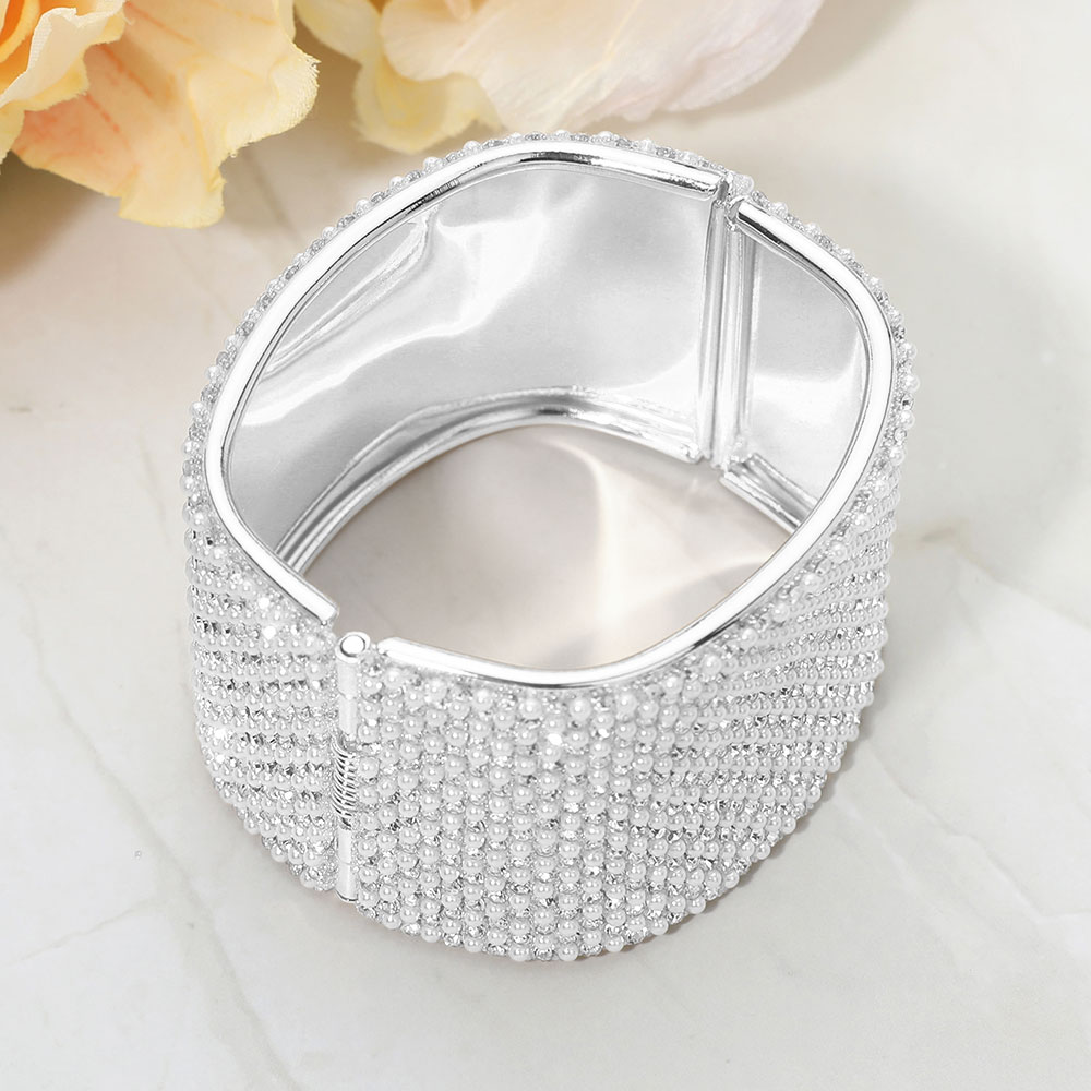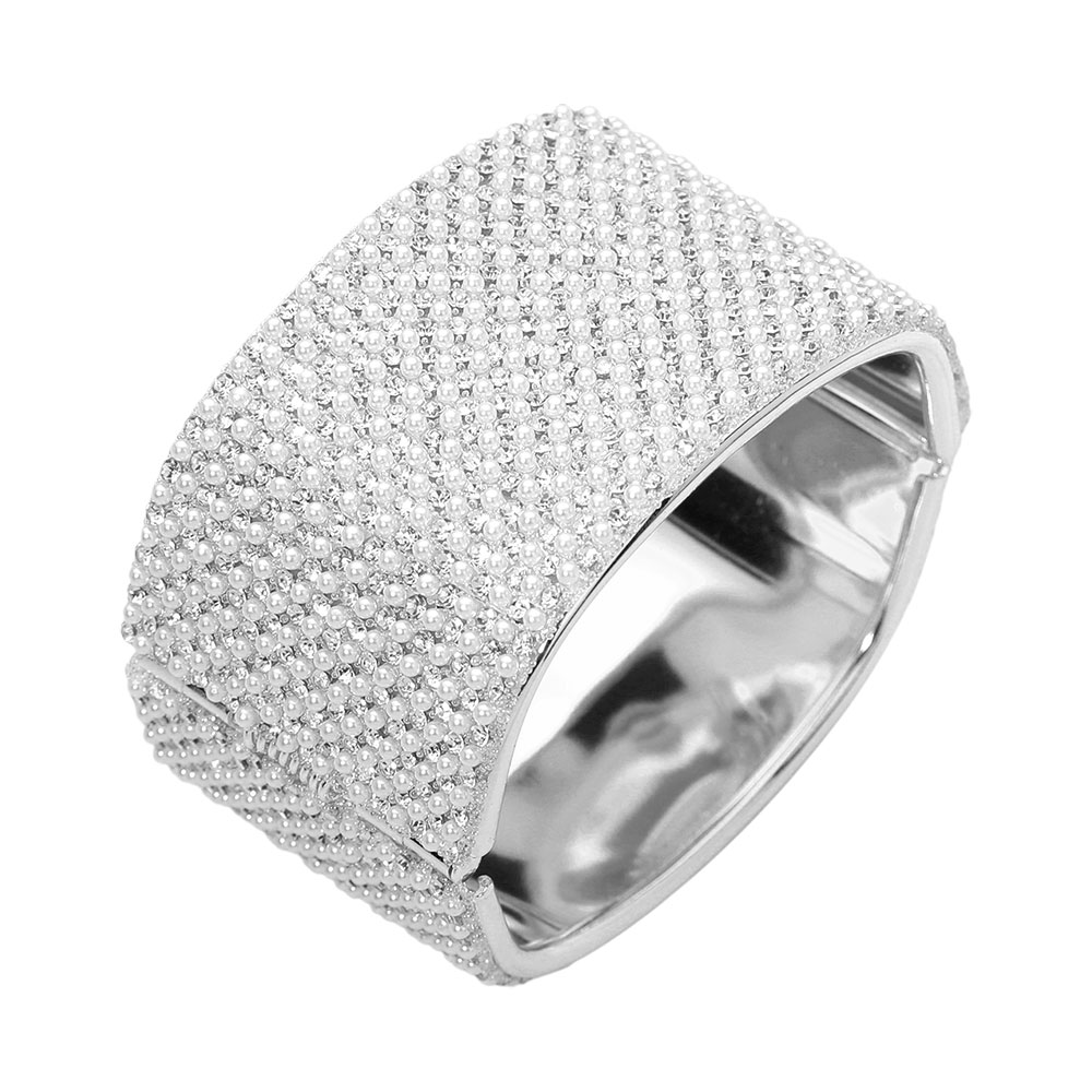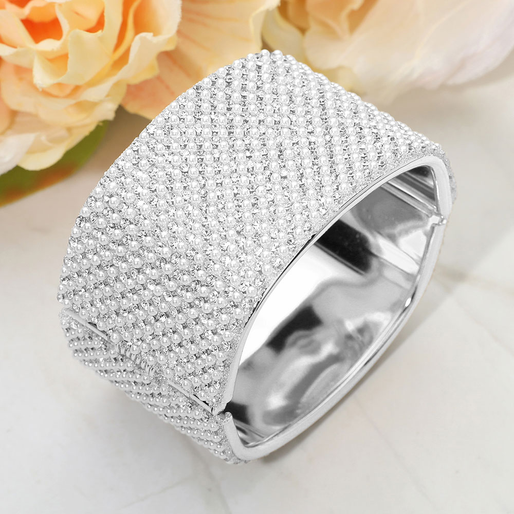 Wide Pearl Paved Hinged Evening Bangle Bracelet