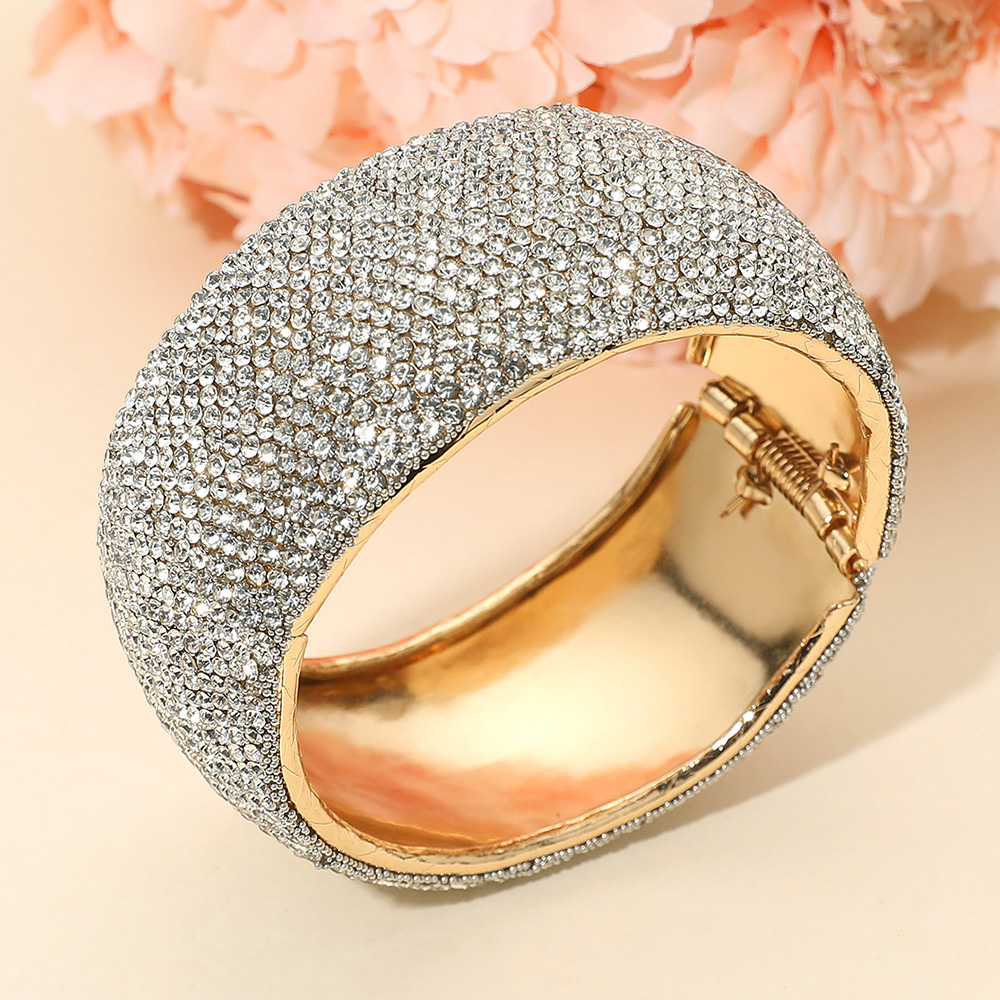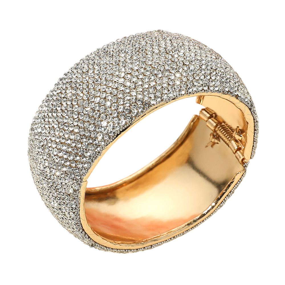 Details • Size : 1.25" H, 2.5" D • Hinged Closure • Elevate your look with this wide crystal pave bracelet featuring a bold, shimmering design. Perfect as a statement bangle for parties, weddings, and special events, this sparkling accessory adds glamour and sophistication to any outfit. • Lead and Nickel Compliant