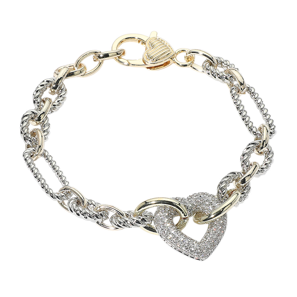 Details • Size : 0.8" H, 7.75" + 1" L • Lobster Clasp Closure • A chic dual-link bracelet featuring a shimmering heart charm that adds a touch of romance and shine. Its layered chain design creates a stylish, eye-catching look perfect for enhancing everyday wear or completing a polished, elegant ensemble. • Gold Dipped • CZ Cubic Zirconia