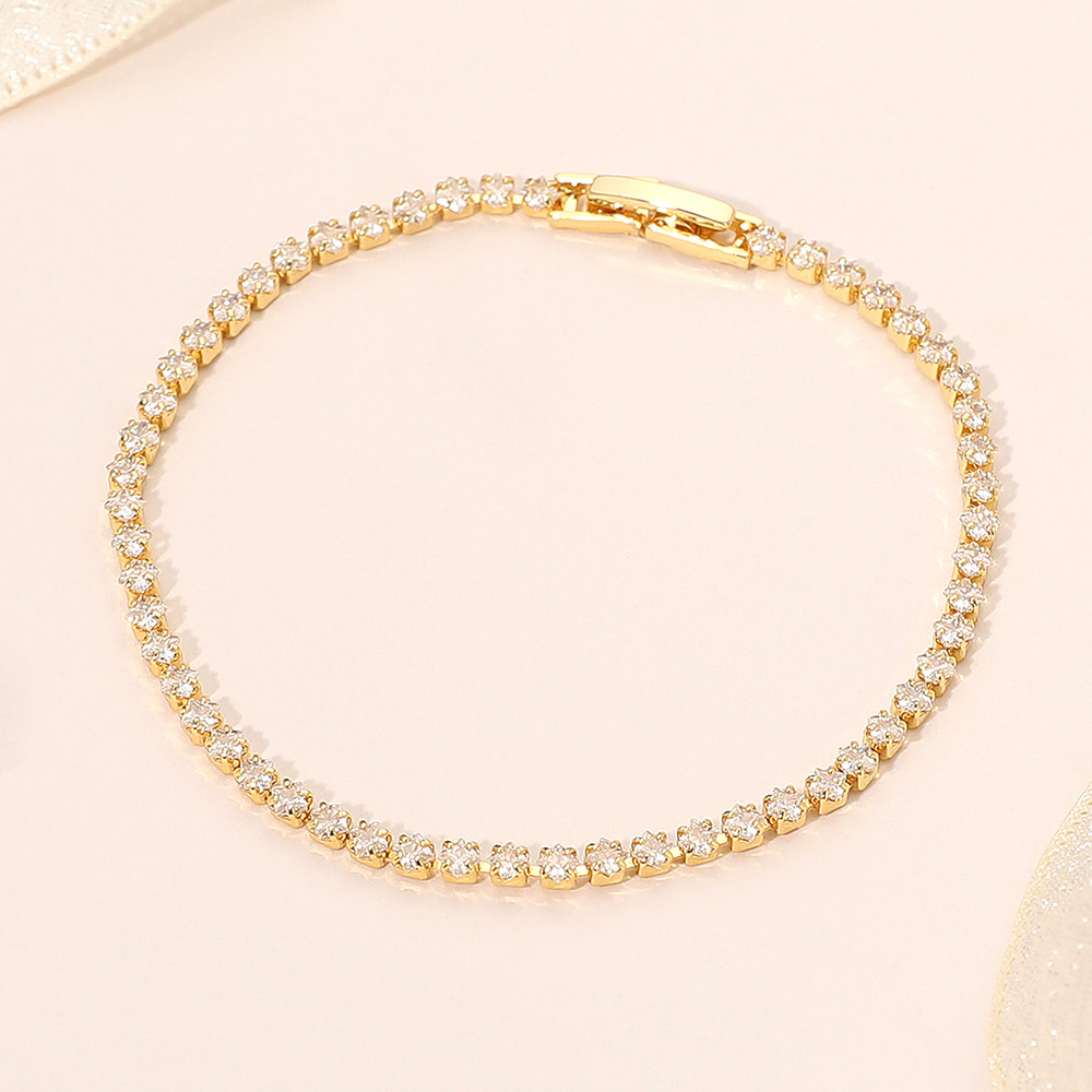 Details • Size : 0.1" H, 6.5" + 1" L • Fold Over Closure • Graceful and refined, this slim crystal tennis bracelet offers a touch of timeless brilliance. Its sleek, minimalist design enhances any outfit with subtle sparkle, making it perfect for everyday elegance or special occasions. A must-have accessory that complements any jewelry collection. • Gold Dipped • Lead and Nickel Compliant