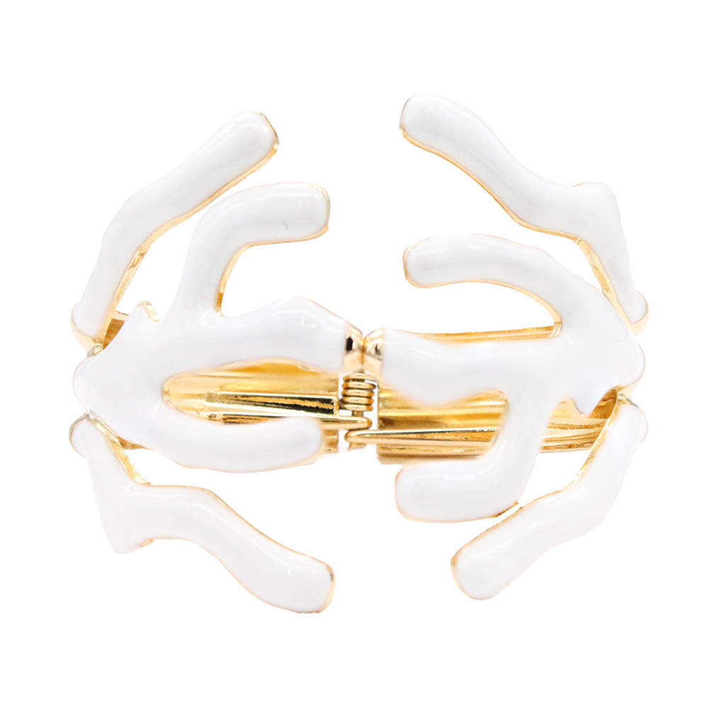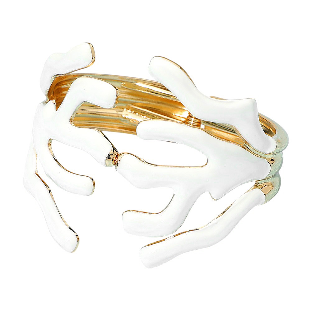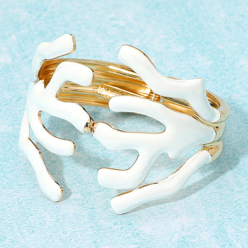 • Bold coral-inspired openwork bracelet featuring fluid branch-like shapes for a modern, sculptural look. Designed with a hinged closure for comfort and style, this statement piece adds a touch of artistic elegance to any outfit, perfect for both casual and evening wear.
