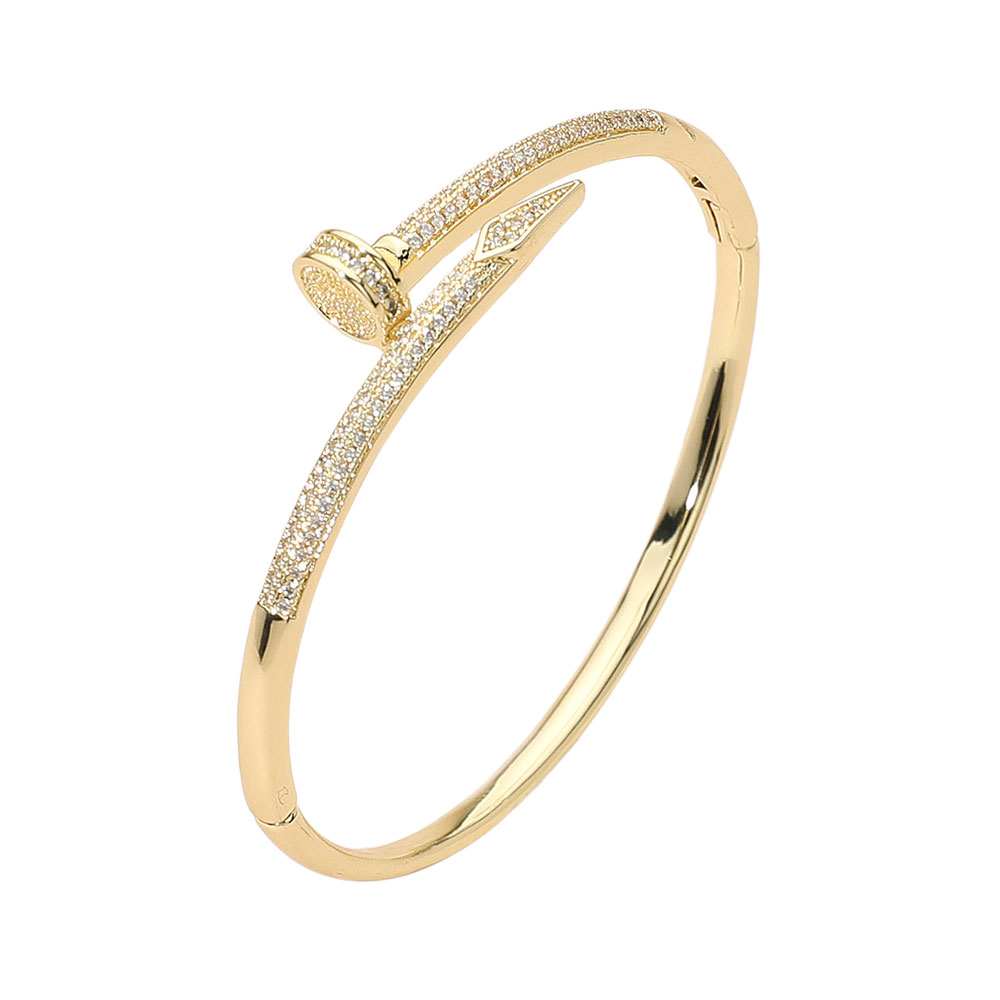 Details • Size : 0.5" H, 2.4" D • Hinged Closure • This elegant cz stone paved nailhead bangle bracelet showcases a sleek, modern silhouette accented with sparkling crystals. Designed for sophistication and style, it offers a statement of refined luxury that pairs beautifully with both everyday and formal looks, adding subtle brilliance to any outfit. • CZ Cubic Zirconia