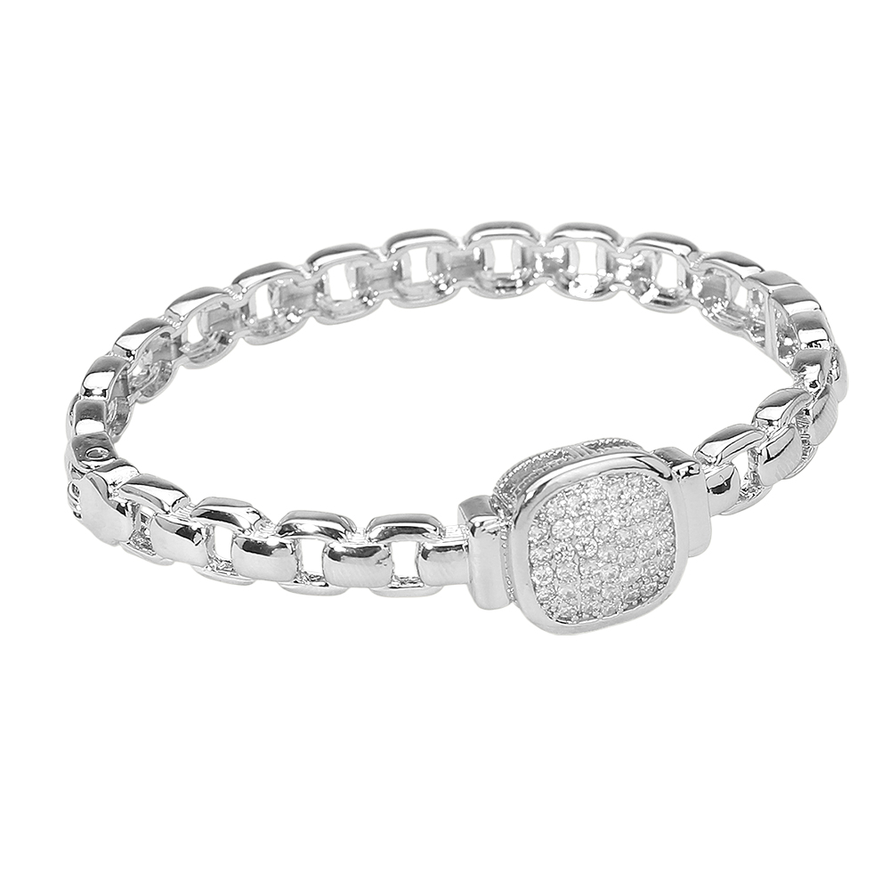 Details • Size : 0.6" H, 2.4" D • Hinged Closure • Sophisticated chain link bangle bracelet designed with a bold square centerpiece adorned in shimmering crystals. A modern statement accessory that adds refined sparkle, perfect for elevating both casual and formal looks. • CZ Cubic Zirconia
