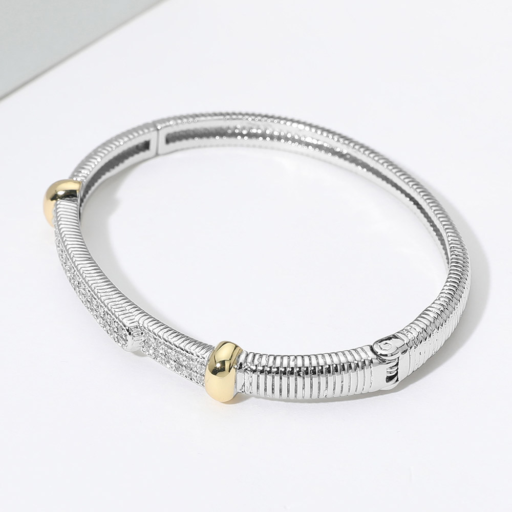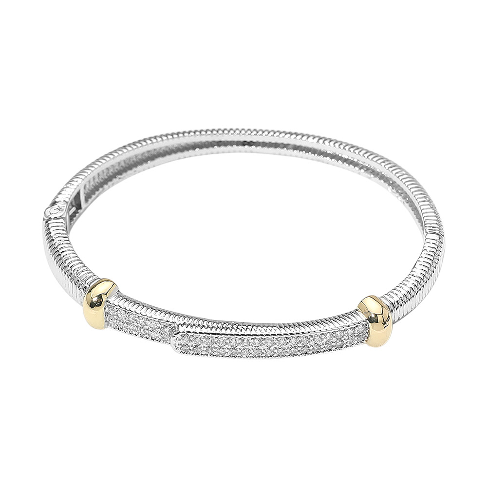 Details • Size : 0.3" H, 2.5" D • Hinged Closure • Sophisticated snake chain bracelet with a sleek crystal-studded bar and polished accents. A refined accessory that blends classic design with a hint of sparkle, ideal for elevating both everyday and formal outfits. • CZ Cubic Zirconia