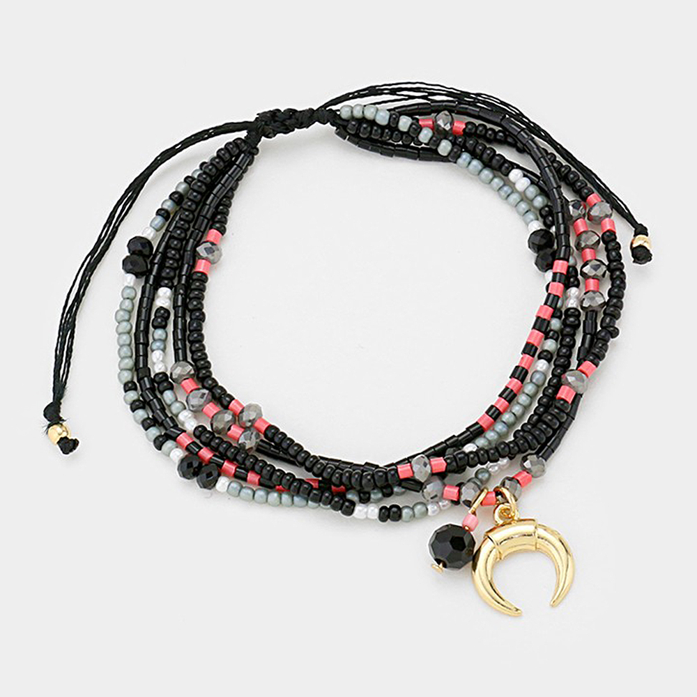 Double Horn Charm Multi-Strand Boho Beaded Adjustable Cinch Pull Tie Bracelet