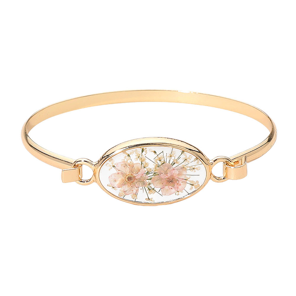 Details • Size : 0.7" H, 2.4" D • Hook Closure • Elevate everyday style with this Floral Encased Oval Bangle Bracelet, featuring a delicate preserved-flower centerpiece inside a sleek oval frame. Designed for comfortable wear and easy layering, it adds a refined, nature-inspired accent to casual looks, work outfits, or special occasions and makes a thoughtful gift choice. • Lead and Nickel Compliant