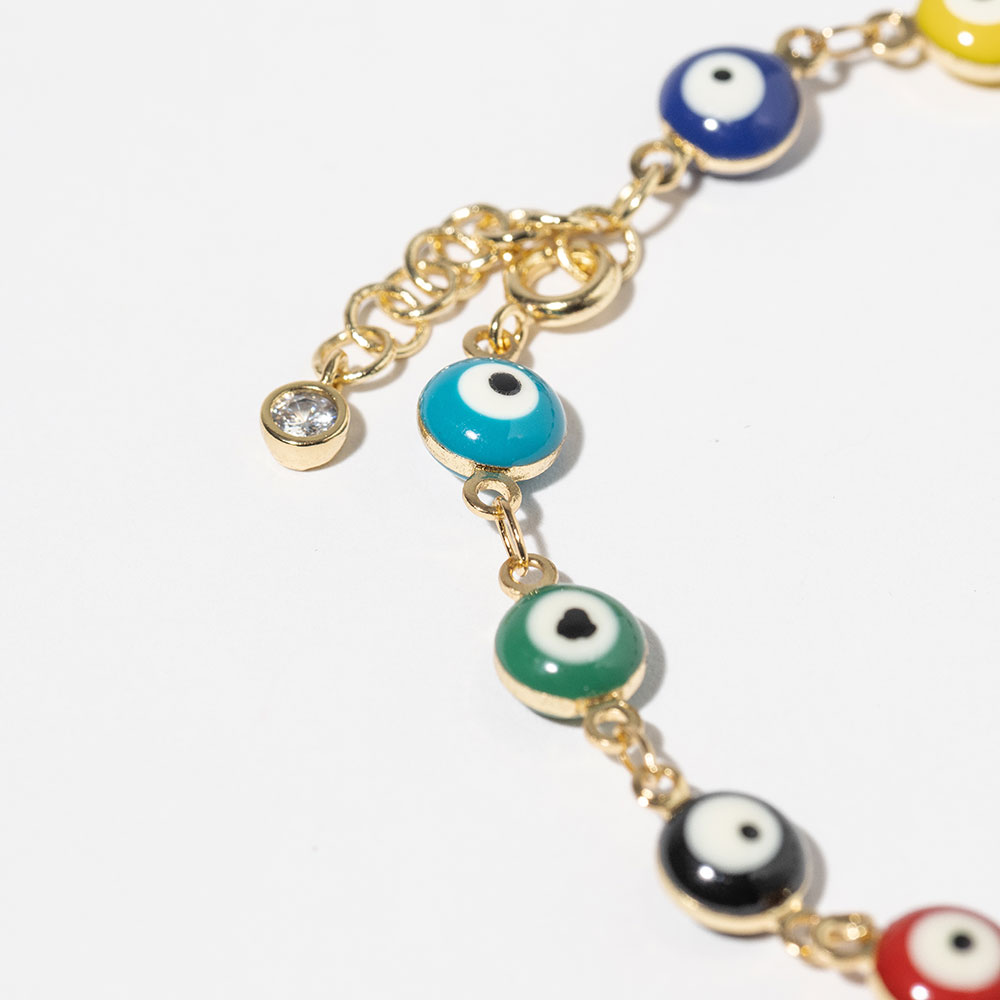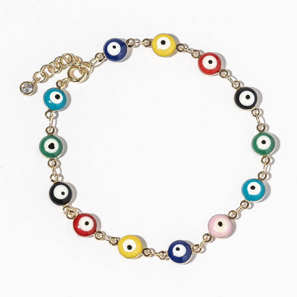 Details • Size : 0.25" H, 7.25" + 1" L • Lobster Clasp Closure • Playful evil eye link bracelet designed with a series of round charms symbolizing protection and positivity. A chic, lightweight accessory that adds a touch of color and meaning to your look, perfect for layering or wearing solo as a trendy everyday good luck piece. • Gold Dipped • Lead and Nickel Compliant • Made In Korea