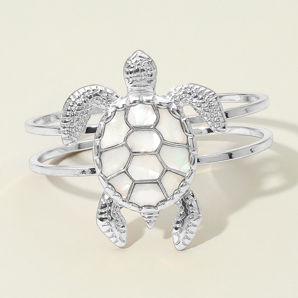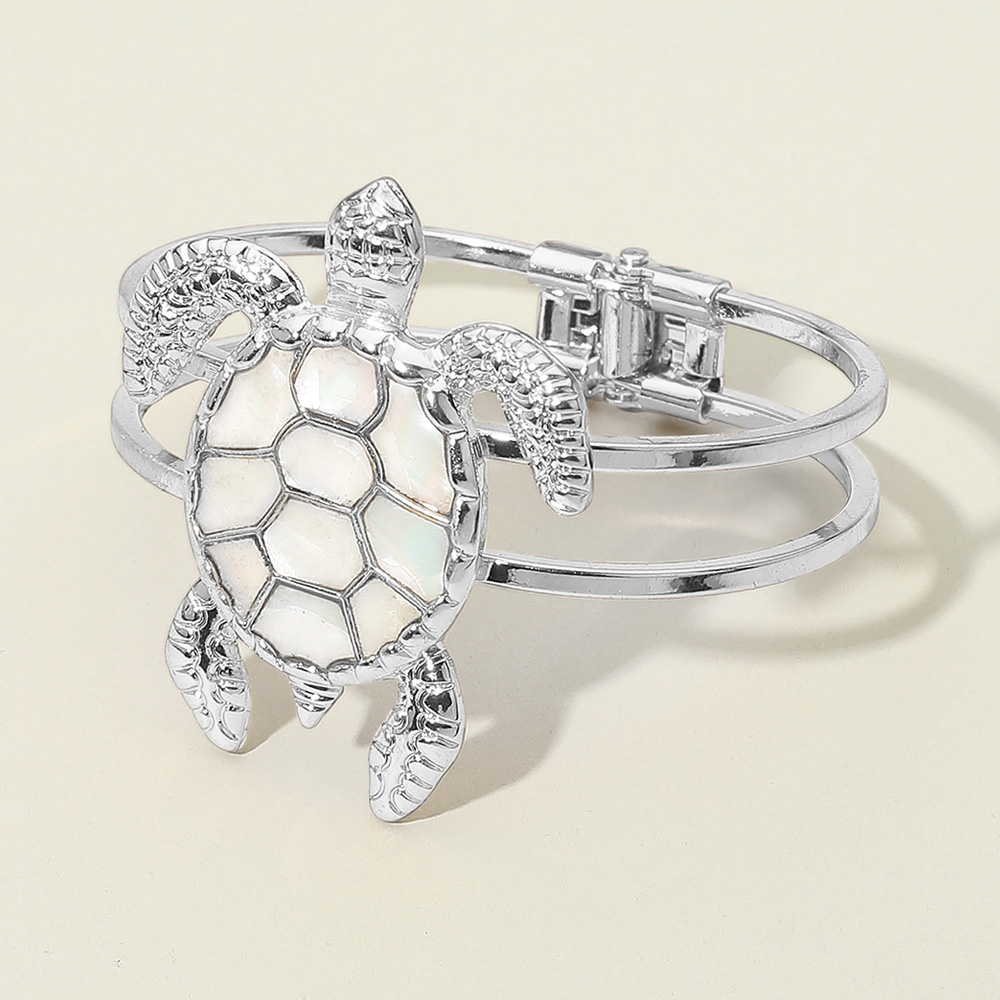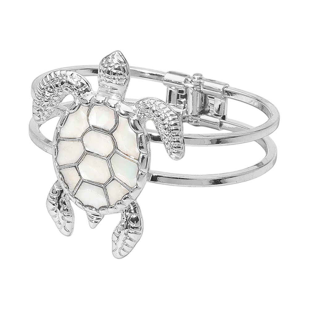 Details • Size : 2.2" H, 2.5" D • Hinged Closure • Make a unique style statement with this turtle cuff bracelet featuring an intricately detailed shell design. Blending charm and symbolism, it adds a playful yet elegant touch to any outfit, making it a standout accessory for ocean-inspired and nature lovers alike. • Lead and Nickel Compliant