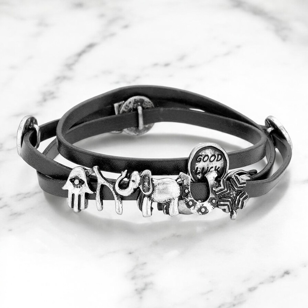 Message Disc Cluster Evil Eye Hamsa Hand & Elephant Faux Leather Wrap Bracelet