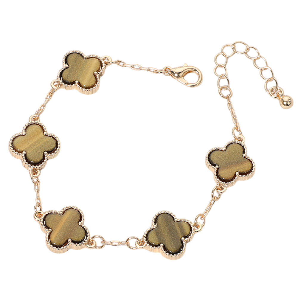 Details • Size : 0.6" H, 6.75" + 2.5" L • Lobster Clasp Closure • Elegant gold chain bracelet featuring five linked quatrefoil charms with a smooth, glossy finish. A timeless and versatile accessory perfect for layering or wearing solo, adding a refined and graceful accent to both casual and formal looks with its classic, chic design. • Lead and Nickel Compliant