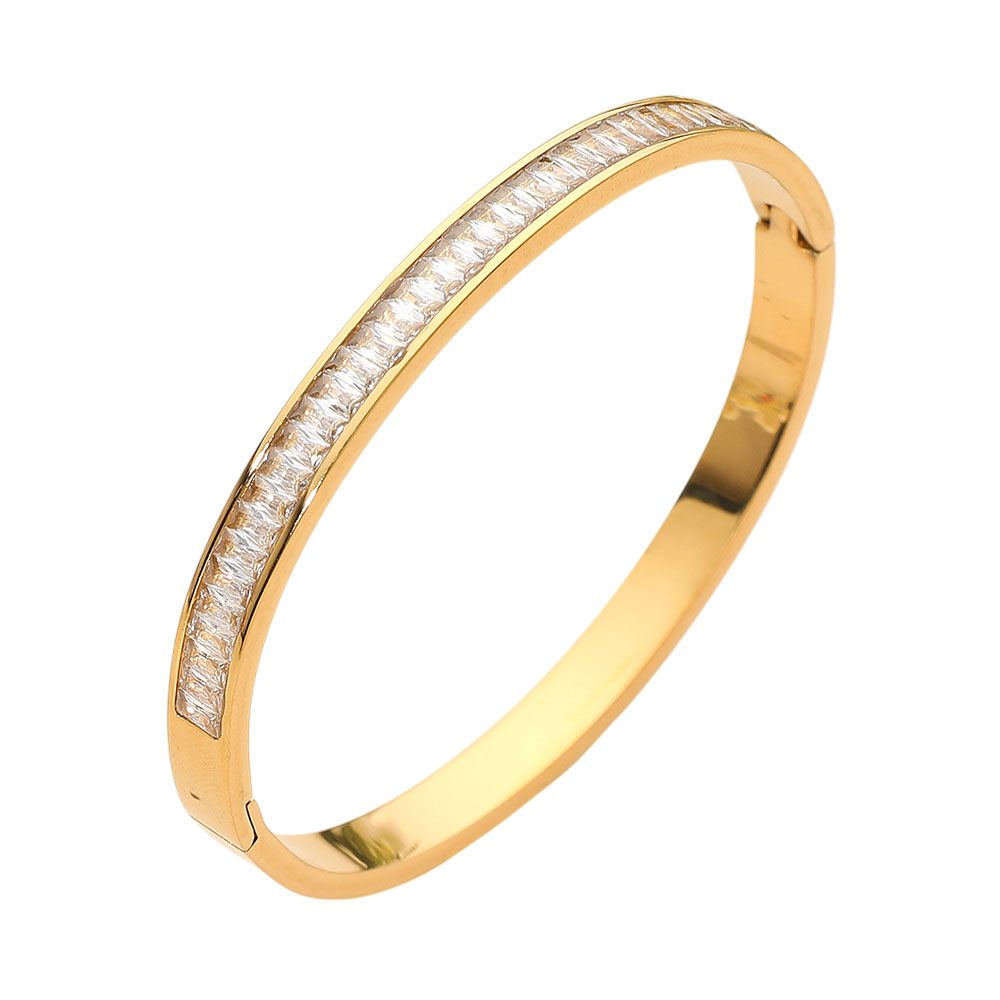 Details • Size : 0.25" H, 2.3" D • Hinged Closure • Water Resistant • Sleek hinge bangle bracelet featuring a refined row of crystal accents set along a polished silhouette for subtle sparkle and modern elegance. Designed for effortless wear, it elevates everyday outfits or completes evening looks with a timeless, sophisticated statement. • Hypoallergenic • Stainless Steel