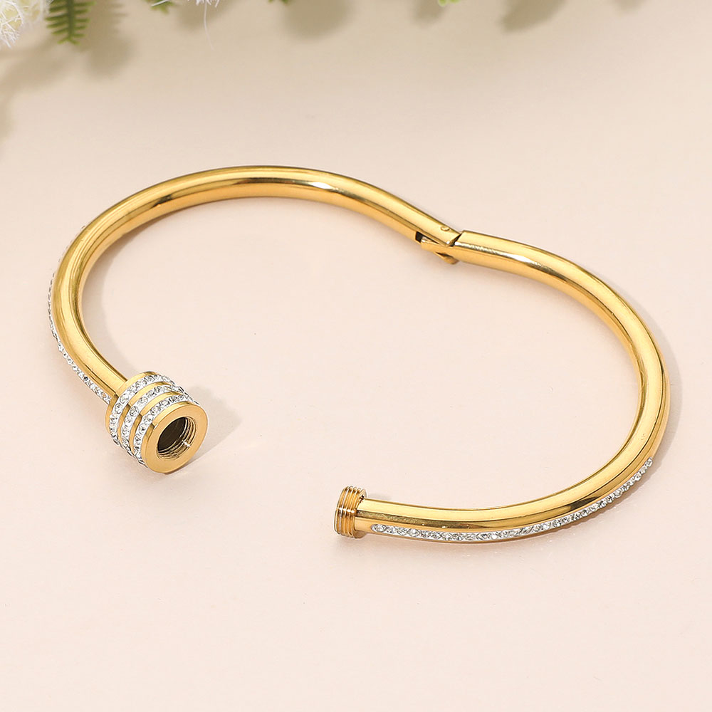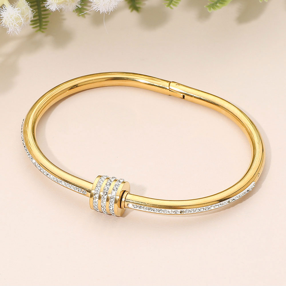 Details • Size : 0.4" H, 2.4" D • Hinged Closure • Water Resistant • Sleek hinge bangle bracelet featuring a signature crystal-accent slider bar detail for modern elegance and subtle sparkle. Designed for effortless wear, this refined accessory transitions seamlessly from everyday outfits to evening styling, delivering a polished statement worn solo or layered. • Hypoallergenic • Stainless Steel