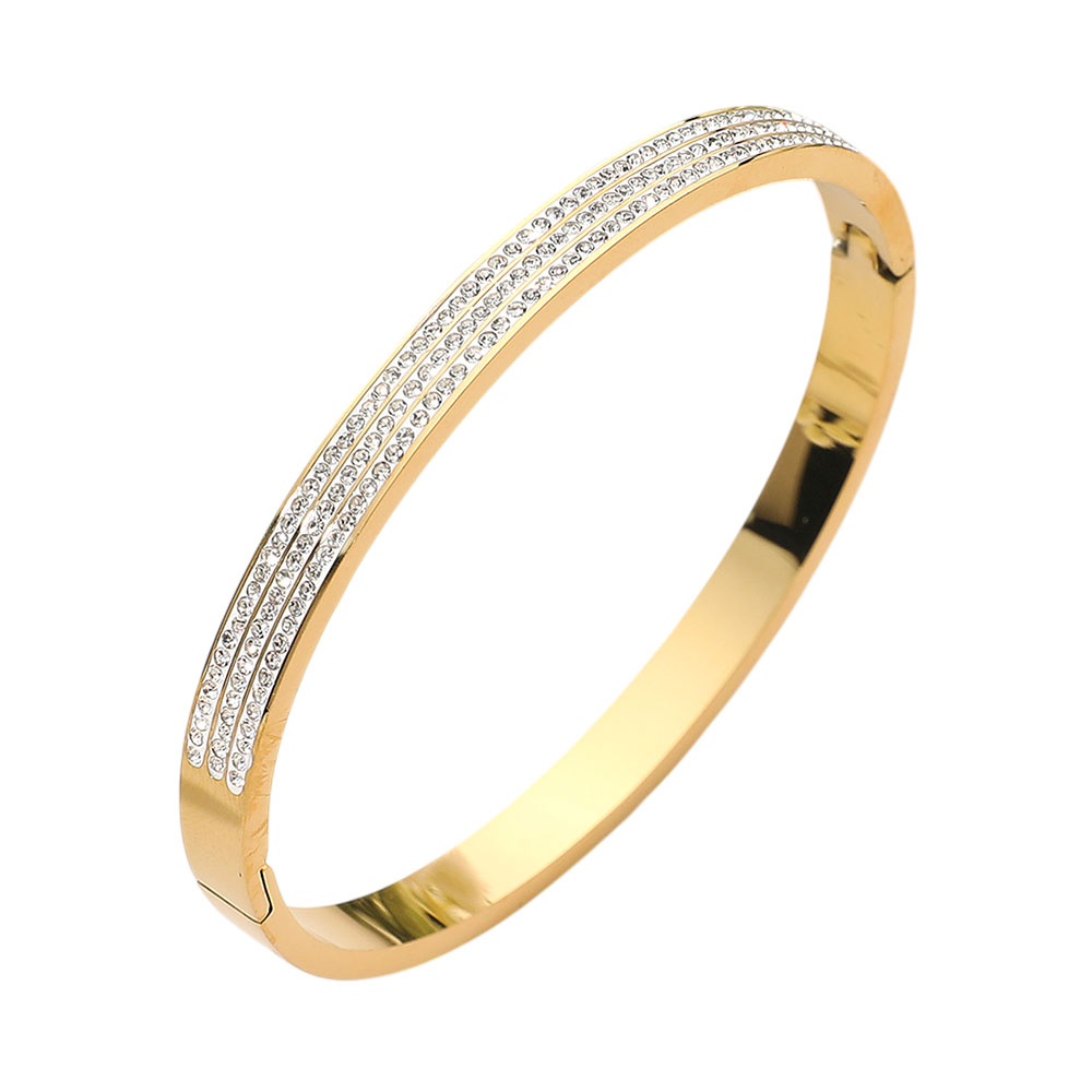 • Sophisticated hinge bangle bracelet featuring three rows of delicate crystal accents set into a sleek polished silhouette for radiant sparkle and refined style. Designed for effortless wear, it transitions seamlessly from everyday outfits to evening looks, adding timeless elegance when worn alone or layered.