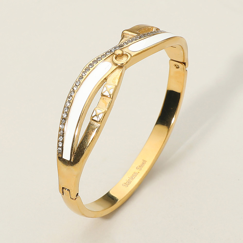 Details • Size : 0.6" H, 2.5" D • Hinged Closure • Modern bangle bracelet featuring geometric detailing and sleek contrasting inlay with a sparkling accent line. Designed with a secure hinged closure, this sophisticated piece adds a refined edge to both everyday looks and evening ensembles. • CZ Cubic Zirconia • Stainless Steel