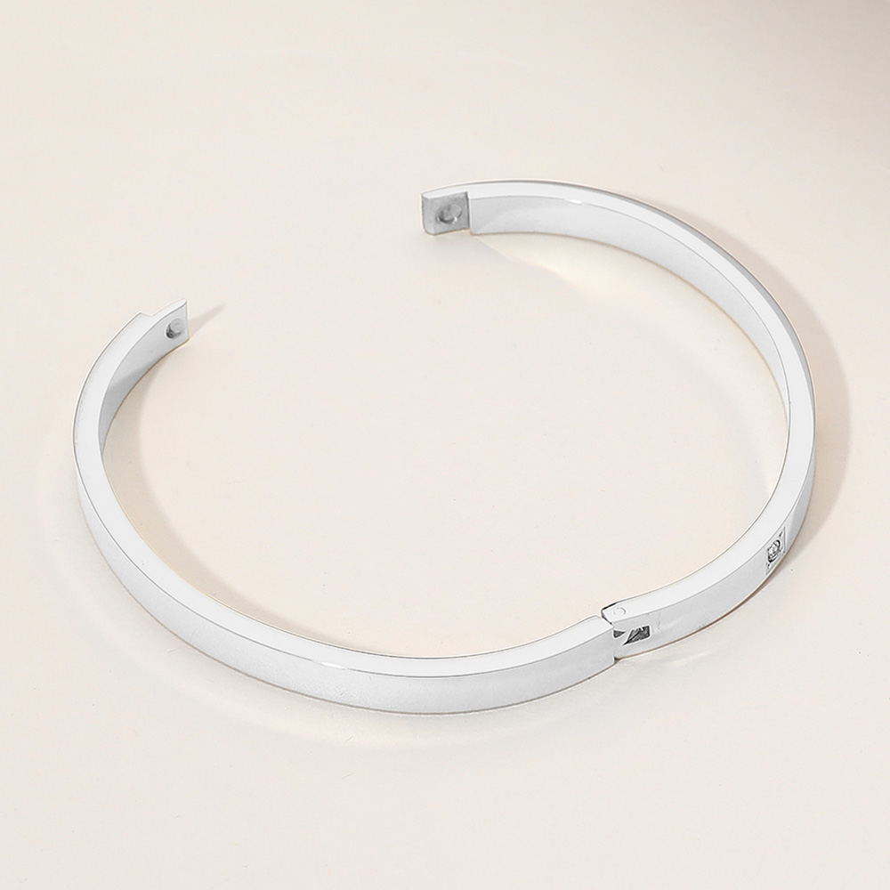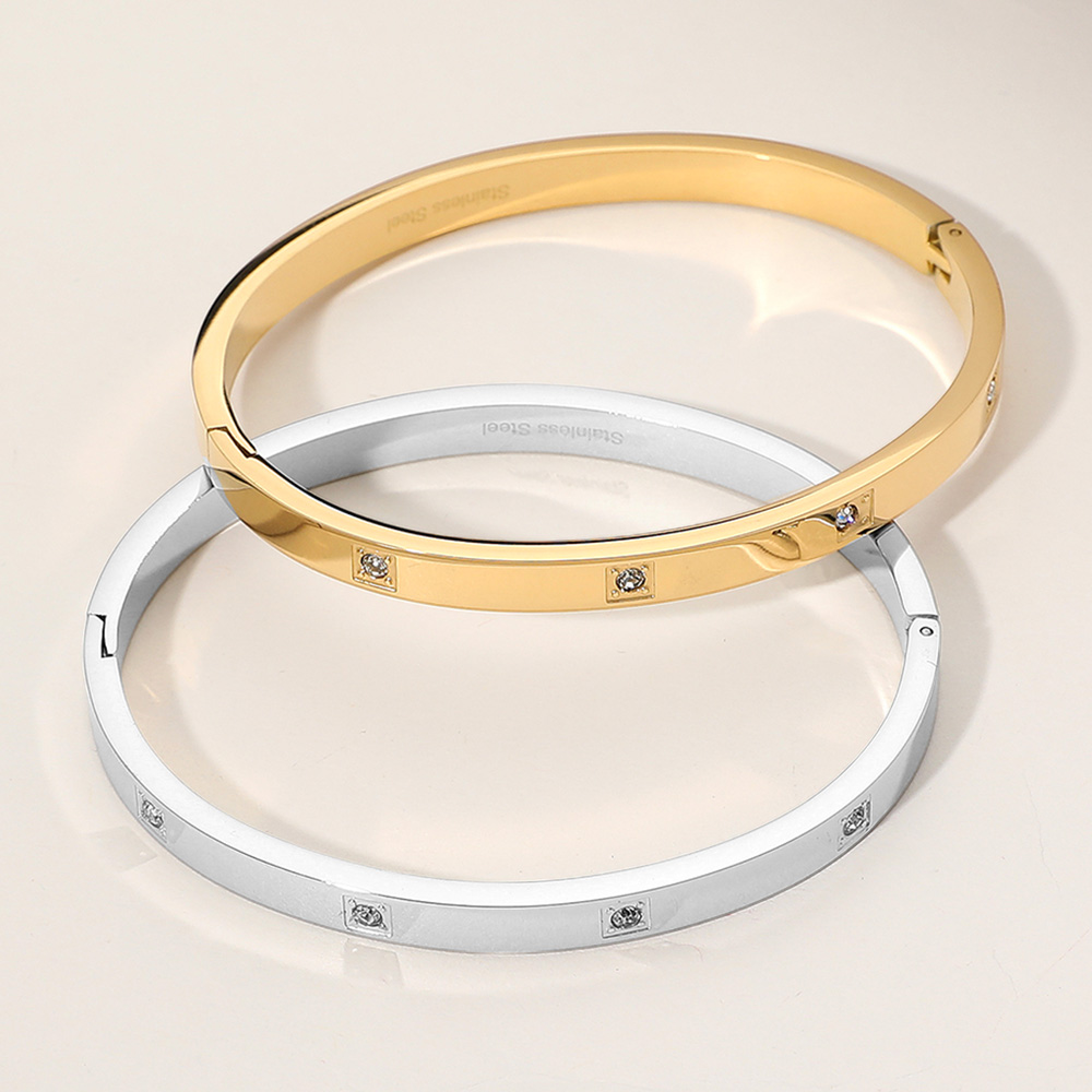 Details • Size : 0.25" H, 2.3" D • Hinged Closure • Elegant bangle bracelet featuring a polished design accented with sparkling crystals for a refined touch. Perfect for stacking or wearing alone, this versatile accessory complements both everyday outfits and formal looks with timeless sophistication. • Stainless Steel