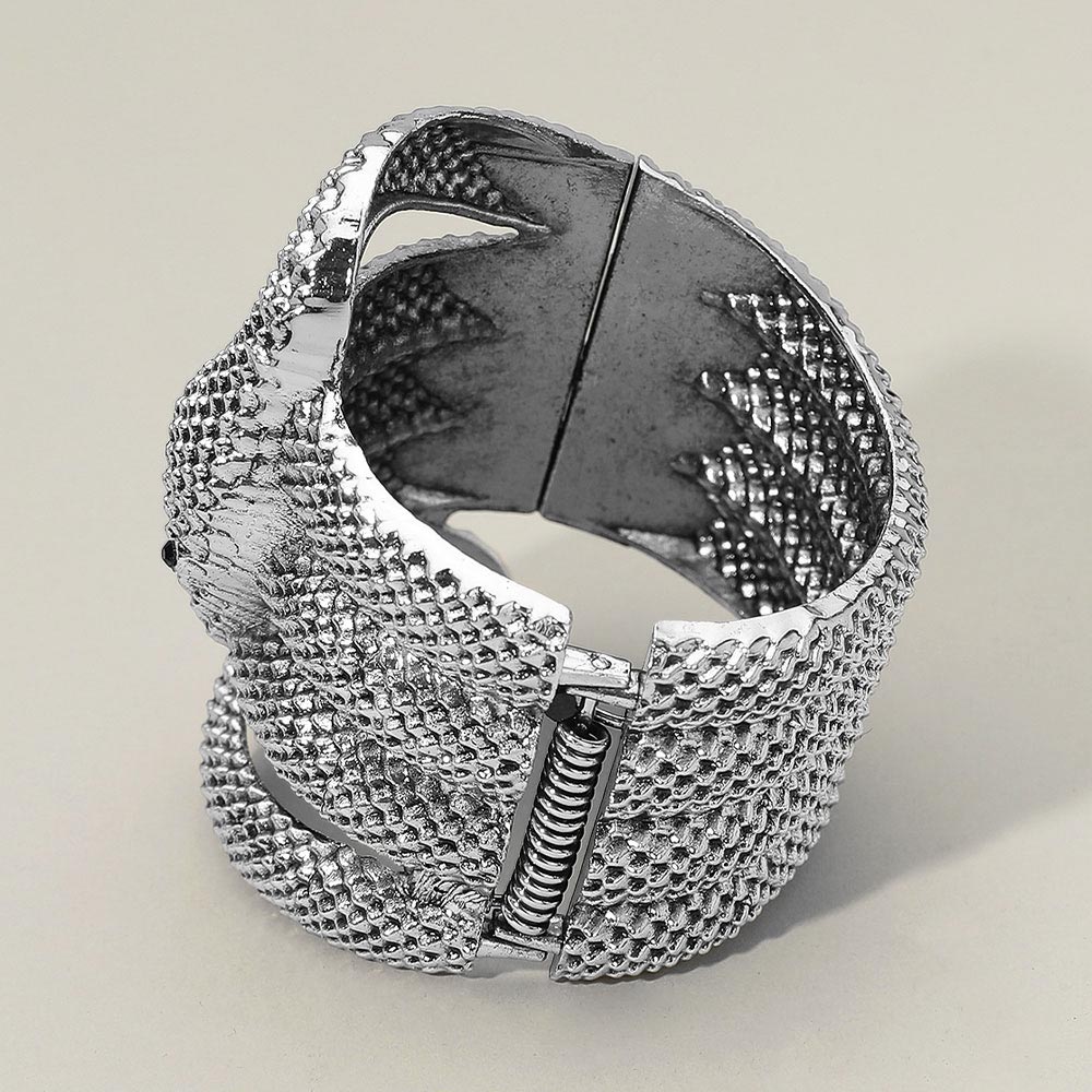 Details • Size : 2.75" H, 2.25" D • Hinged Closure • Striking coiled snake bracelet featuring a detailed serpent wrap design with textured scales and bold sculptural form. This statement cuff adds a fierce, fashion-forward edge to any outfit, perfect for showcasing confidence and individuality in both casual and evening looks. • Lead and Nickel Compliant