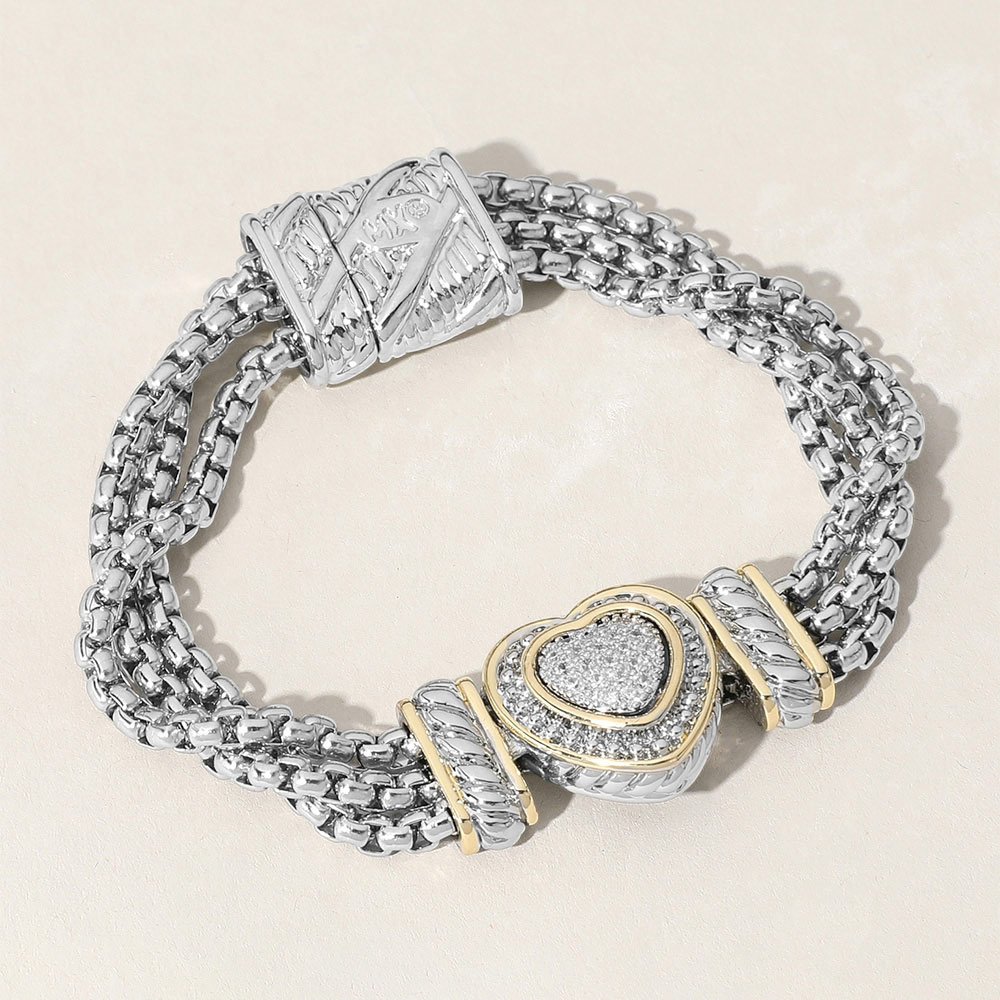 Details • Size : 0.75" H, 7" L • Magnetic Closure • Chic multi-strand bracelet with a heart-shaped centerpiece embellished with sparkling accents. Designed with a secure magnetic clasp, this elegant bracelet adds a stylish touch to everyday wear and special occasions. • Gold Dipped • CZ Cubic Zirconia