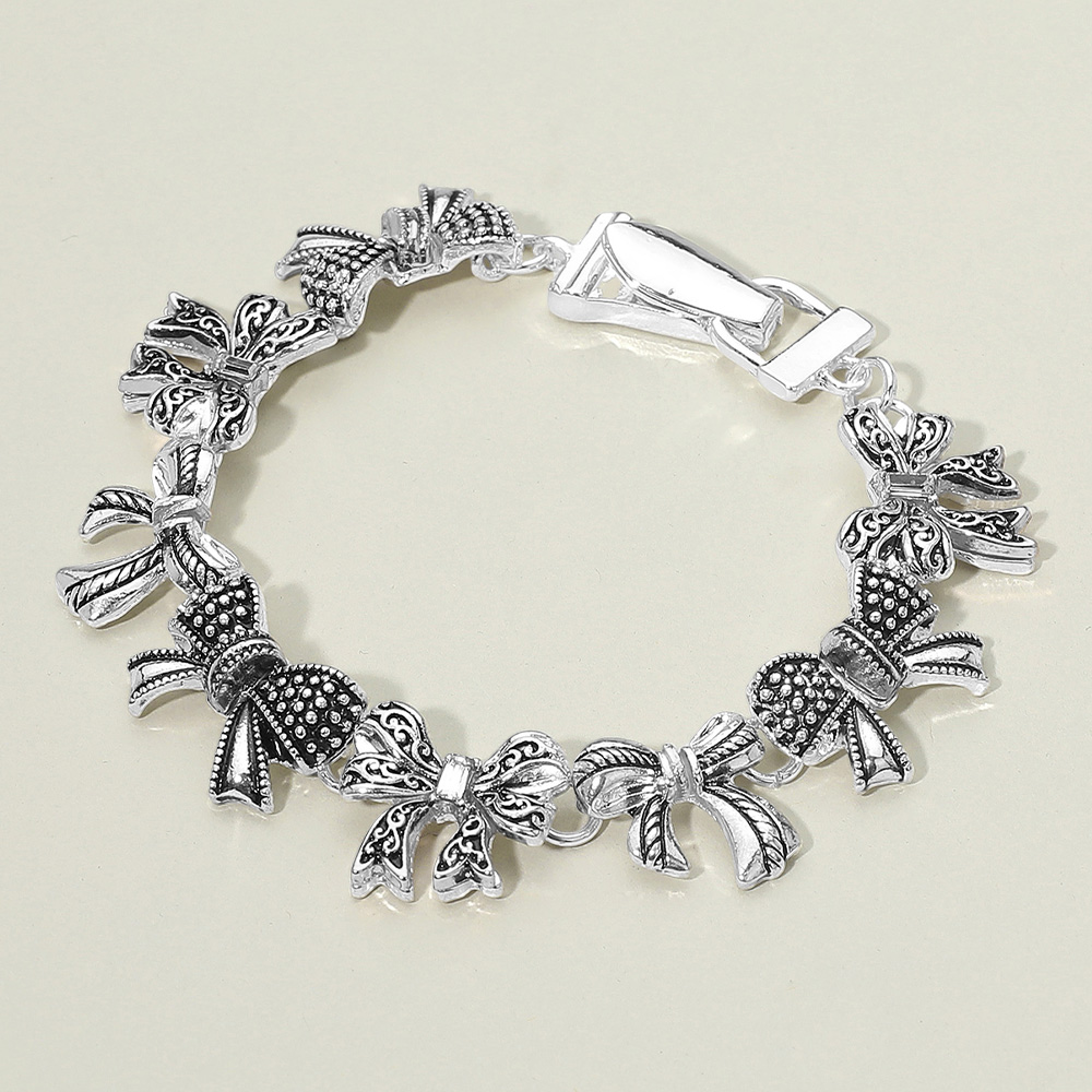 Details • Size : 0.7" H, 7" + 1" L • Magnetic Closure • Adorn your wrist with timeless elegance through this vintage bow charm bracelet, featuring intricate antique detailing and dual-tone accents. A graceful and feminine accessory that blends charm with sophistication, ideal for everyday wear or thoughtful gifting. • Lead and Nickel Compliant