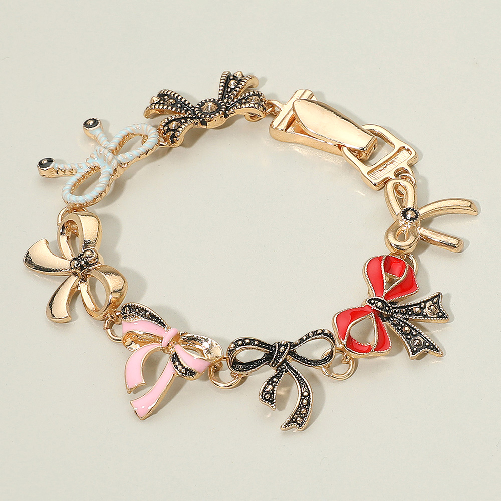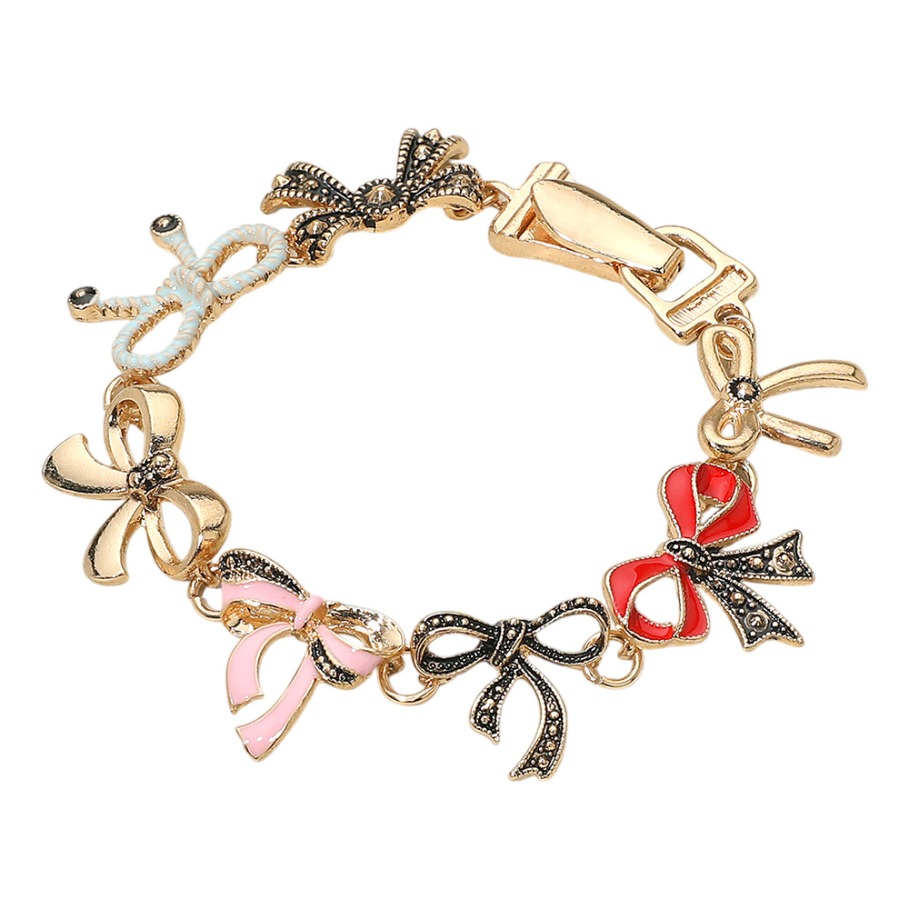 Details • Size : 0.75" H, 7" + 1" L • Magnetic Closure • Elevate your style with this playful bow bracelet, featuring a collection of intricately designed charms with colorful accents. A whimsical yet elegant piece that adds charm to any outfit, making it a delightful accessory or thoughtful gift. • Lead and Nickel Compliant