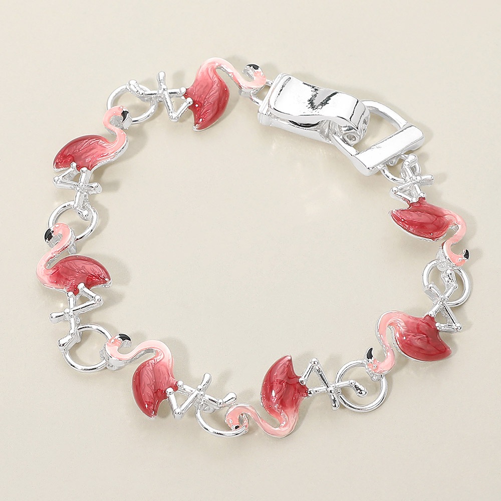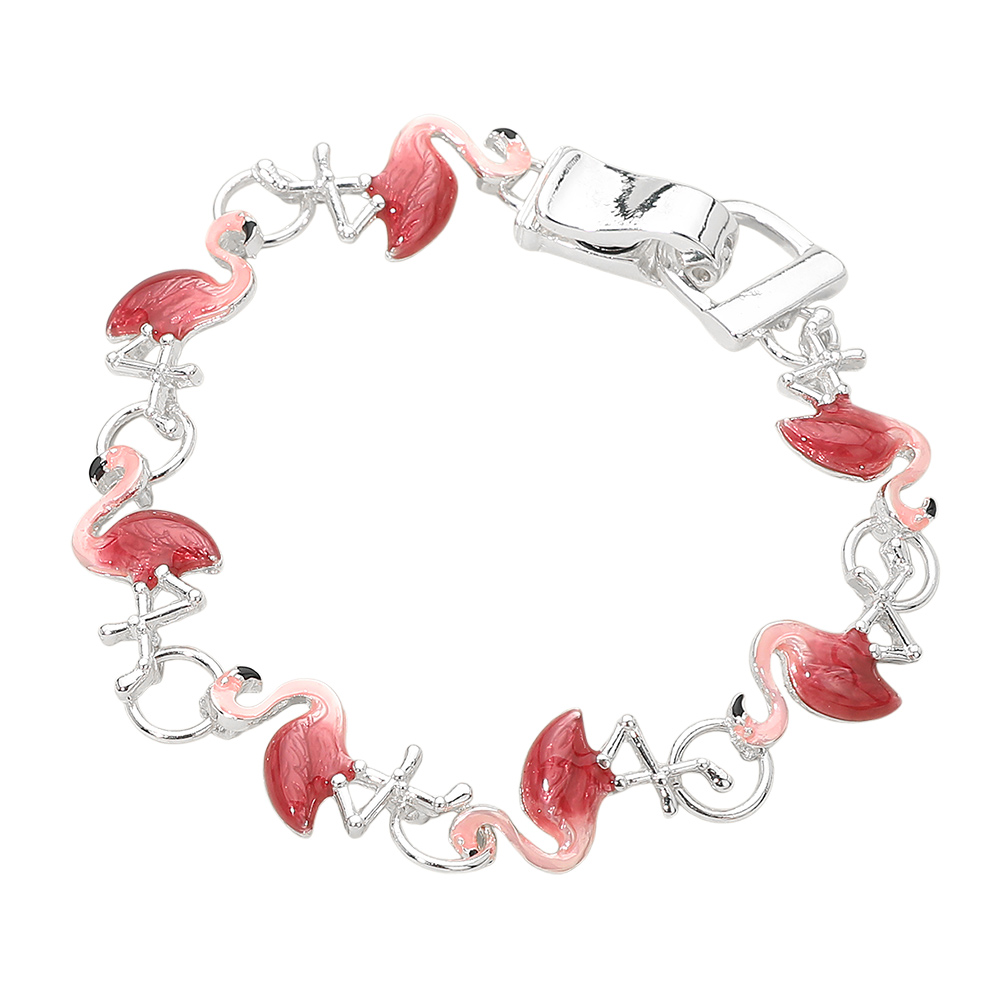 • Playful flamingo link bracelet designed with detailed bird-shaped charms connected in a fun, resort-inspired silhouette. Ideal for beach boutiques, vacation shops, zoo gift stores, and summer accessory assortments, offering eye-catching novelty with easy everyday wear appeal.