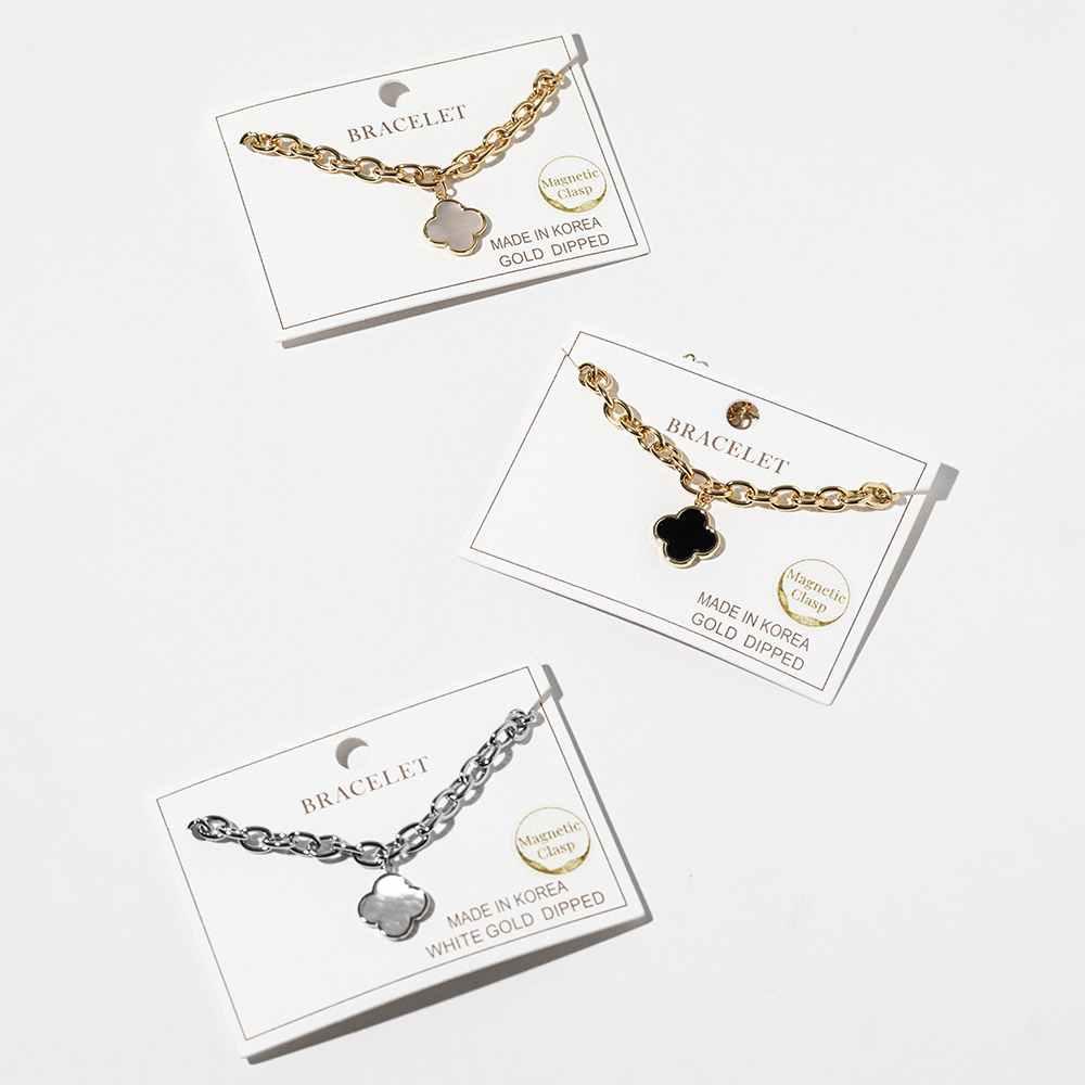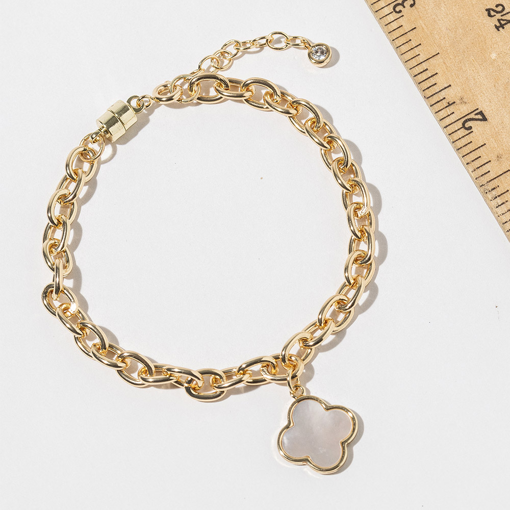 Details • Size : 0.25" H, 7" + 1" L • Charm Size : 0.6" X 0.6" • Magnetic Clasp Closure • Elevate your everyday style with this charming link bracelet featuring a delicate quatrefoil drop accent and an easy magnetic closure for effortless wear. Its polished shine and elegant silhouette make it perfect for stacking, gifting, or adding a touch of refinement to any look. Ideal for casual or dressy outfits. • Gold Dipped • Lead and Nickel Compliant • Made In Korea