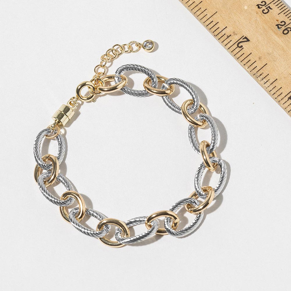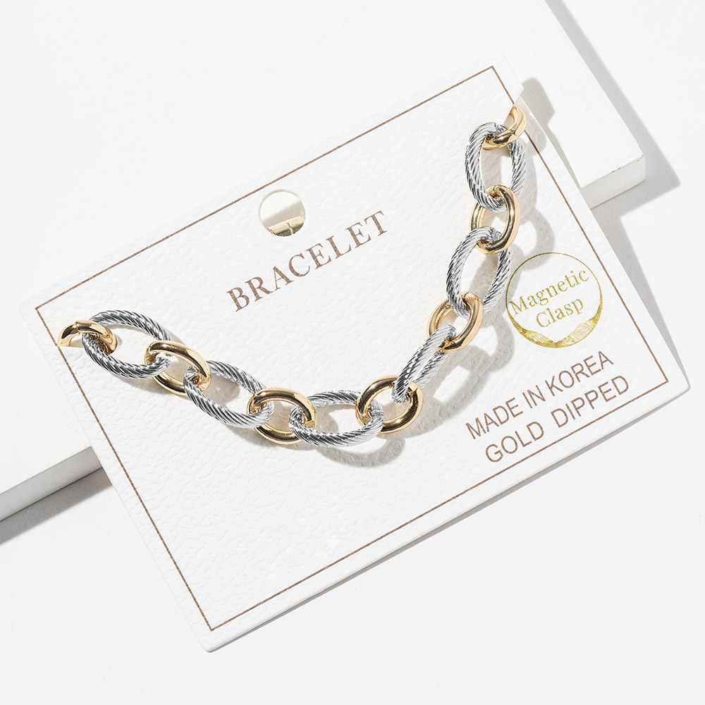 Details • Size : 0.4" H, 7" + 1" L • Magnetic Clasp Closure • Discover a stylish chain link bracelet featuring textured oval links and a convenient magnetic clasp for effortless wear. Its modern dual-tone look adds character to everyday outfits and enhances any layered stack. Ideal for gifting or accessorizing with a sleek, contemporary touch. • Gold Dipped • Lead and Nickel Compliant • Made In Korea