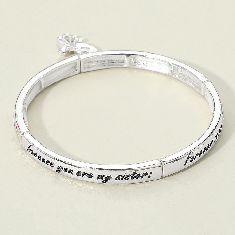 Details • Size : 0.25" H • Charm Size : 0.5" X 0.6" • Stretchable • Sister’s Blessing bracelet with engraved heartfelt message and angel charm, symbolizing love and friendship. A meaningful keepsake that celebrates the special bond between sisters, making it a thoughtful gift to express gratitude, affection, and connection that lasts forever. • Lead and Nickel Compliant