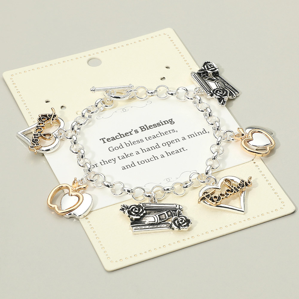 Details • Size : 1" H, 7.5" L • Toggle Closure • Celebrate the dedication of teachers with this Teacher’s Blessing charm bracelet featuring meaningful charms and an uplifting message. A thoughtful accessory that honors their passion and impact, this bracelet is the perfect gift to express gratitude and admiration. • Lead and Nickel Compliant