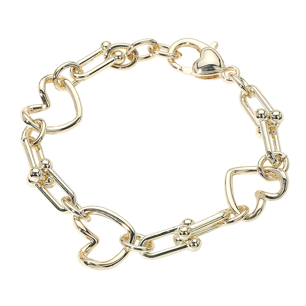 Details • Size : 0.6" H, 7.25" + 0.5" L • Lobster Clasp Closure • Delicate bracelet featuring open heart-shaped links and sleek connectors. Secures with a lobster clasp, adding romantic charm and elegance to any outfit with a minimalist touch. • Gold Dipped