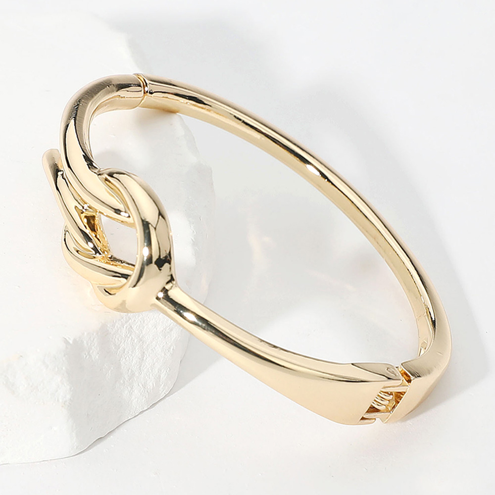 Details • Size : 0.7" H, 2.4" D • Hinged Closure • This elegant bangle bracelet features a sculptural knot detail symbolizing unity and strength. With its smooth, high-shine finish and secure clasp, it offers a refined look that transitions effortlessly from everyday wear to special occasions.