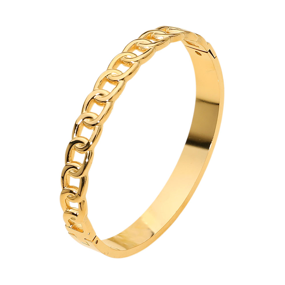 Details • Size : 0.3" H, 2.4" D • Hinged Closure • Water & Tarnish Resistant • A sleek hinged bangle featuring a refined chain-style accent for a modern, sculptural profile. Designed for easy wear with a secure closure, this bracelet adds subtle statement appeal that layers effortlessly or stands alone to elevate everyday and special-occasion looks. • Stainless Steel