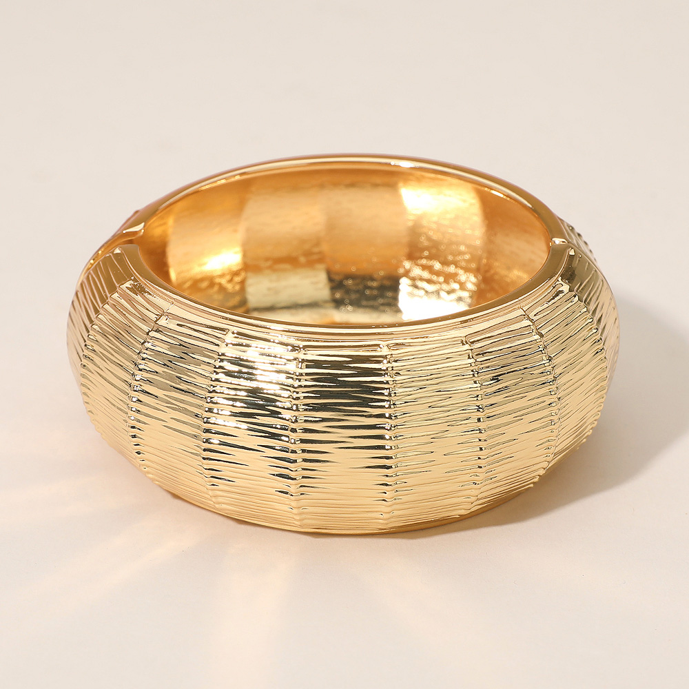 Details • Size : 1.25" H, 2.3" D • Hinged Closure • Make a bold impression with this textured wide bangle bracelet featuring a sleek, eye-catching design. Perfect for elevating casual or dressy outfits, this statement piece adds a touch of modern elegance and sophistication to your accessory collection.