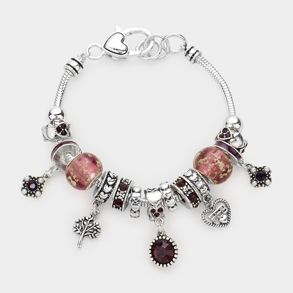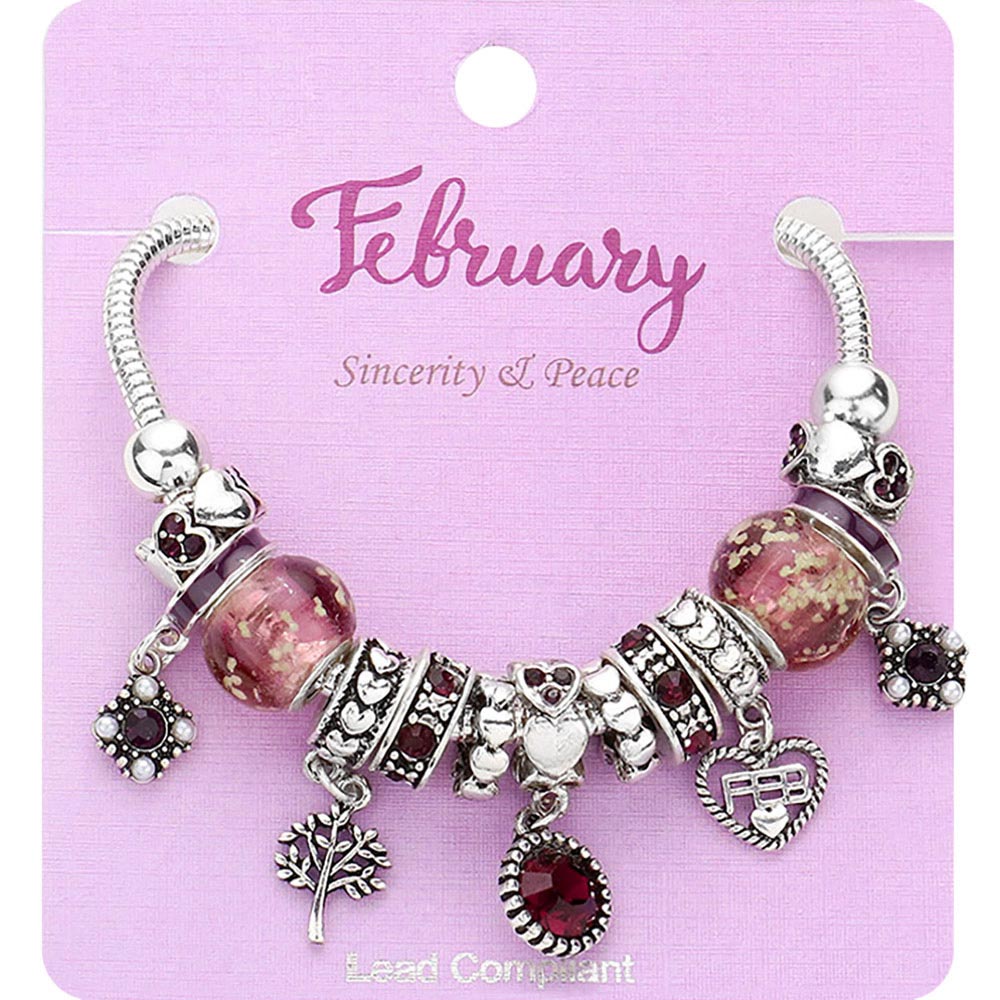 February - Birthstone Heart Charm Multi Beaded Bracelet