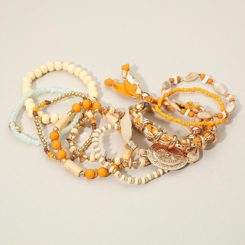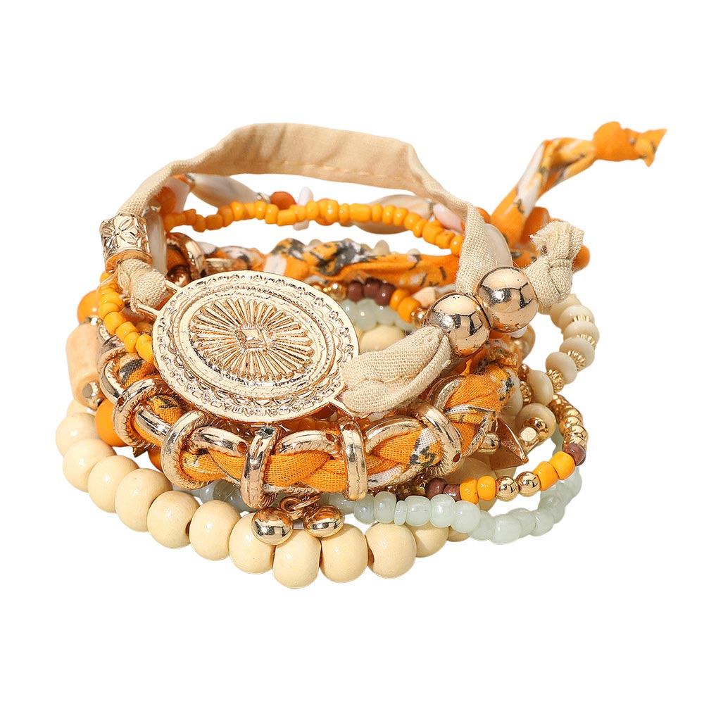 Details • Size 1 : 1.5" H / Stretchable • Size 2 : 1.25" H / Adjustable • Boho layered charm bracelet set featuring stretch strands with mixed beads, fabric-wrapped details, and a bold medallion accent for a stylish artisan look. Designed for stacking and everyday wear, adding a unique handcrafted vibe that enhances casual outfits, festival fashion, and gifting occasions. • Lead and Nickel Compliant • Made In India