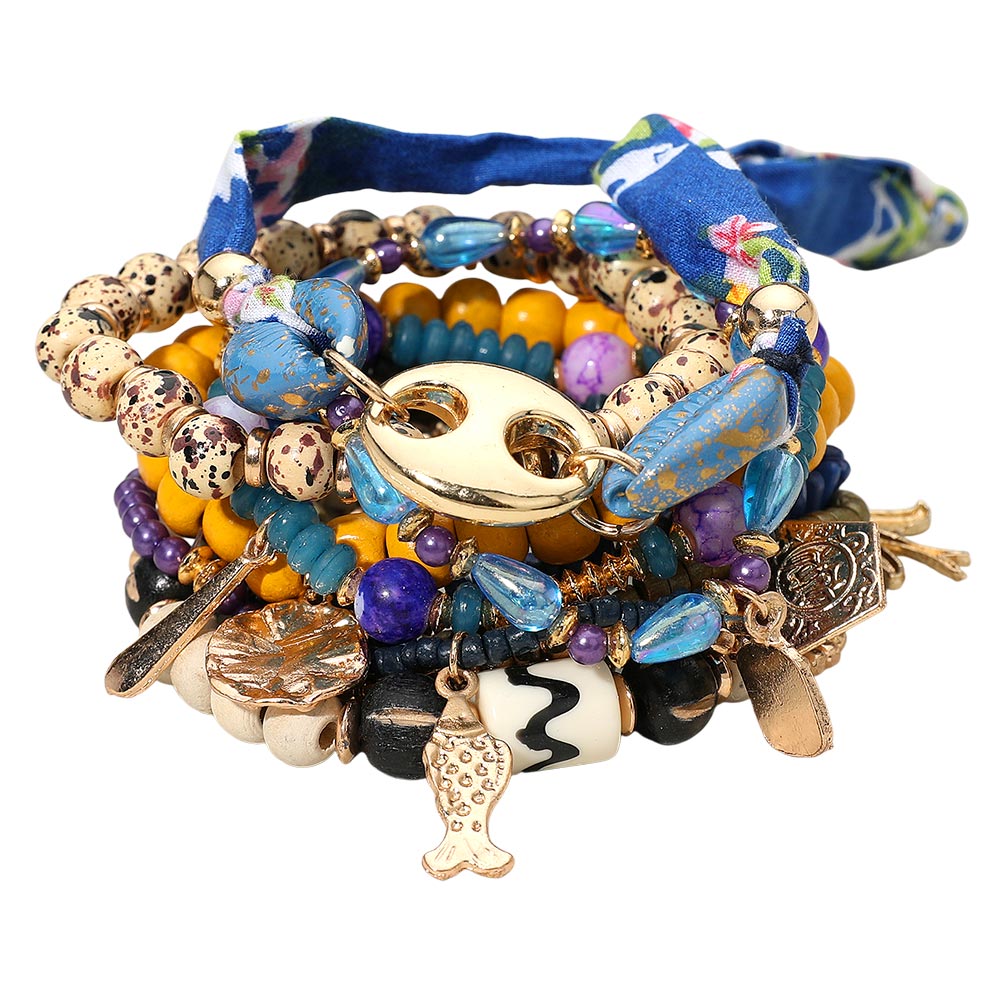Details • Size 1 : 2.25" H / Stretchable • Size 2 : 0.5' H / Adjustable • Size 3 : 0.4" H, 7" + 2" L / Lobster Clasp Closure • A bold bracelet set featuring a lively mix of beads, playful charms, and patterned fabric accents. Designed for stacked styling, it adds effortless personality and movement to everyday looks while offering a fun, expressive accessory option. • Lead and Nickel Compliant • Made In India