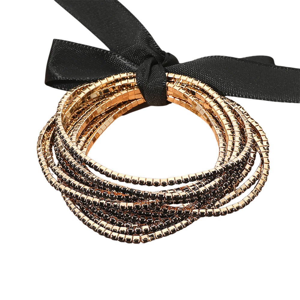 12PCS - Ribbon Slim Rhinestone Stretch Multi Layered Bracelet