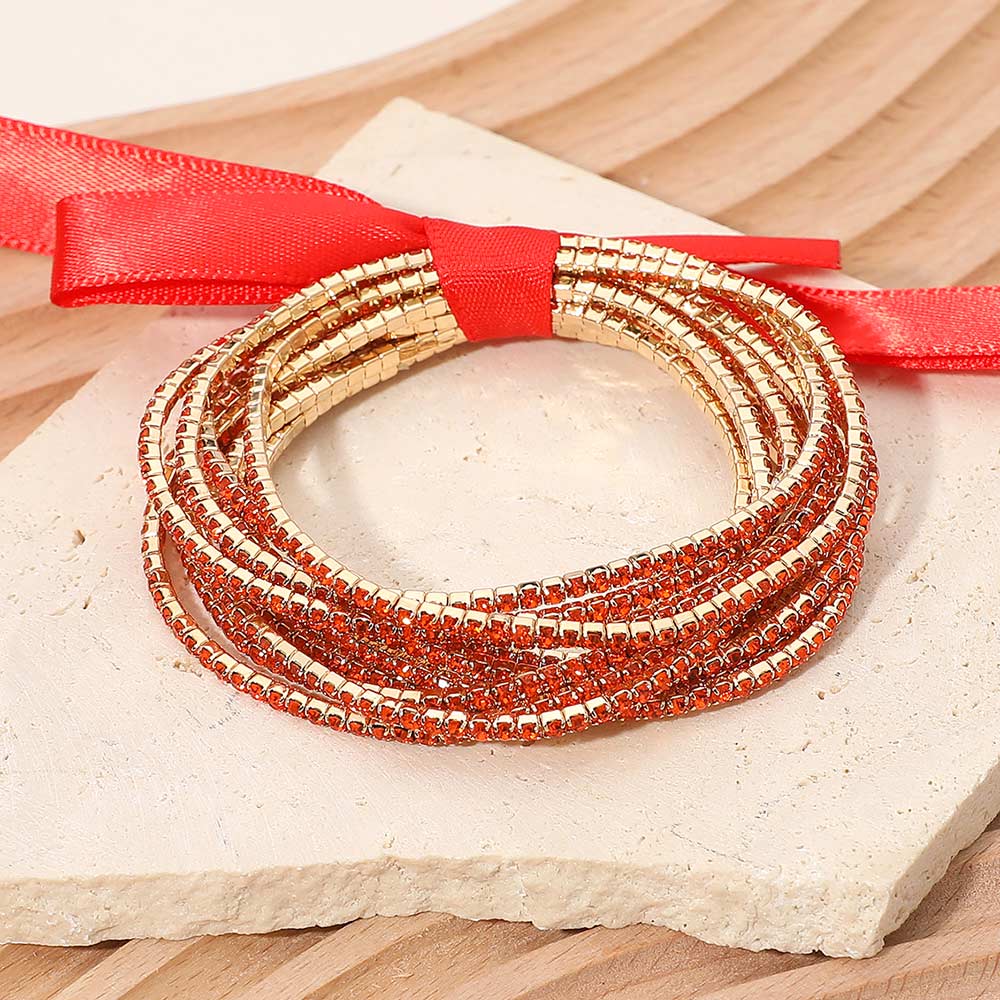 • Elegant layered stretch bracelet set featuring multiple slim bands tied together with a decorative ribbon. The stackable circular design adds texture and shine, perfect for both casual layering and festive occasions.