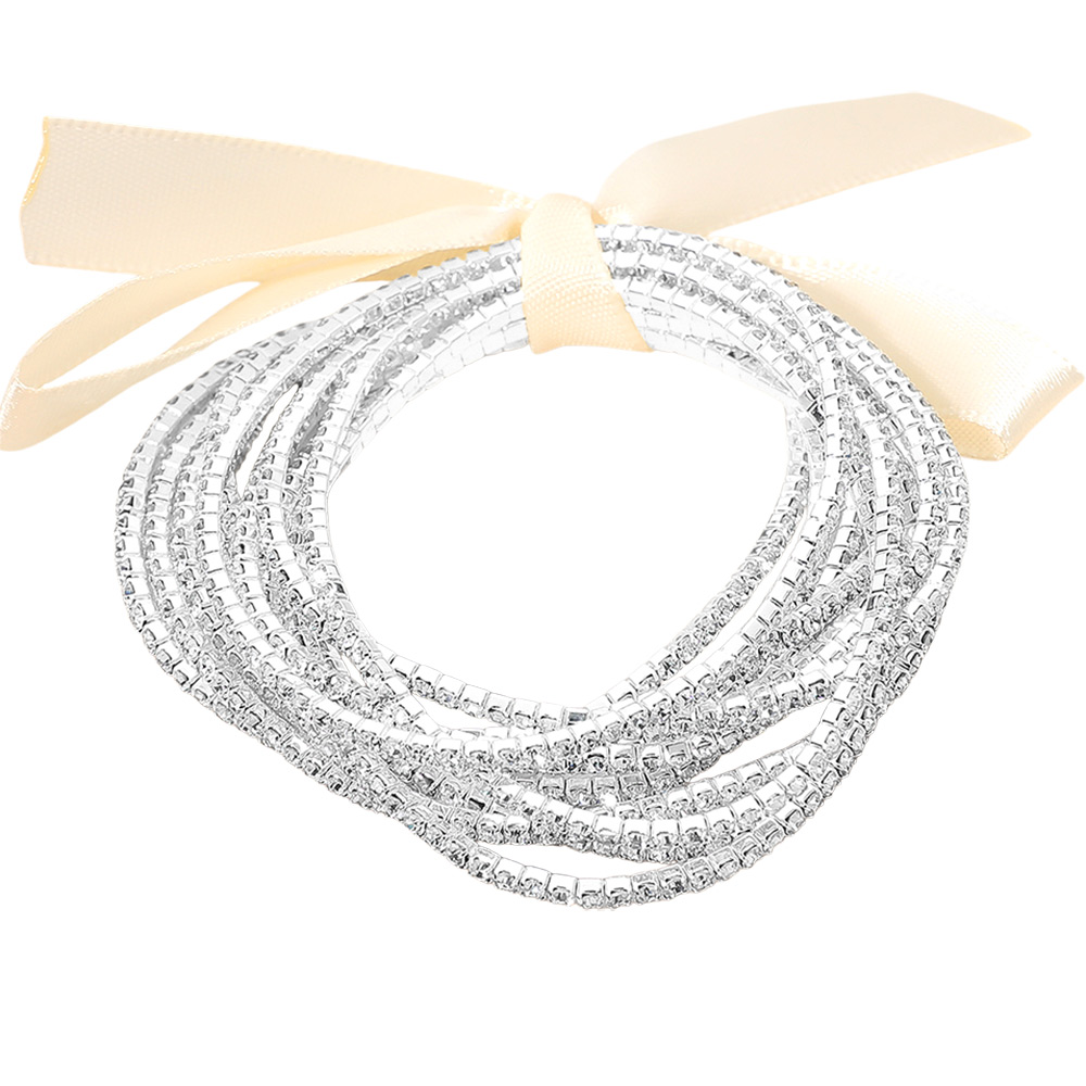 12PCS - Ribbon Slim Rhinestone Stretch Multi Layered Bracelet
