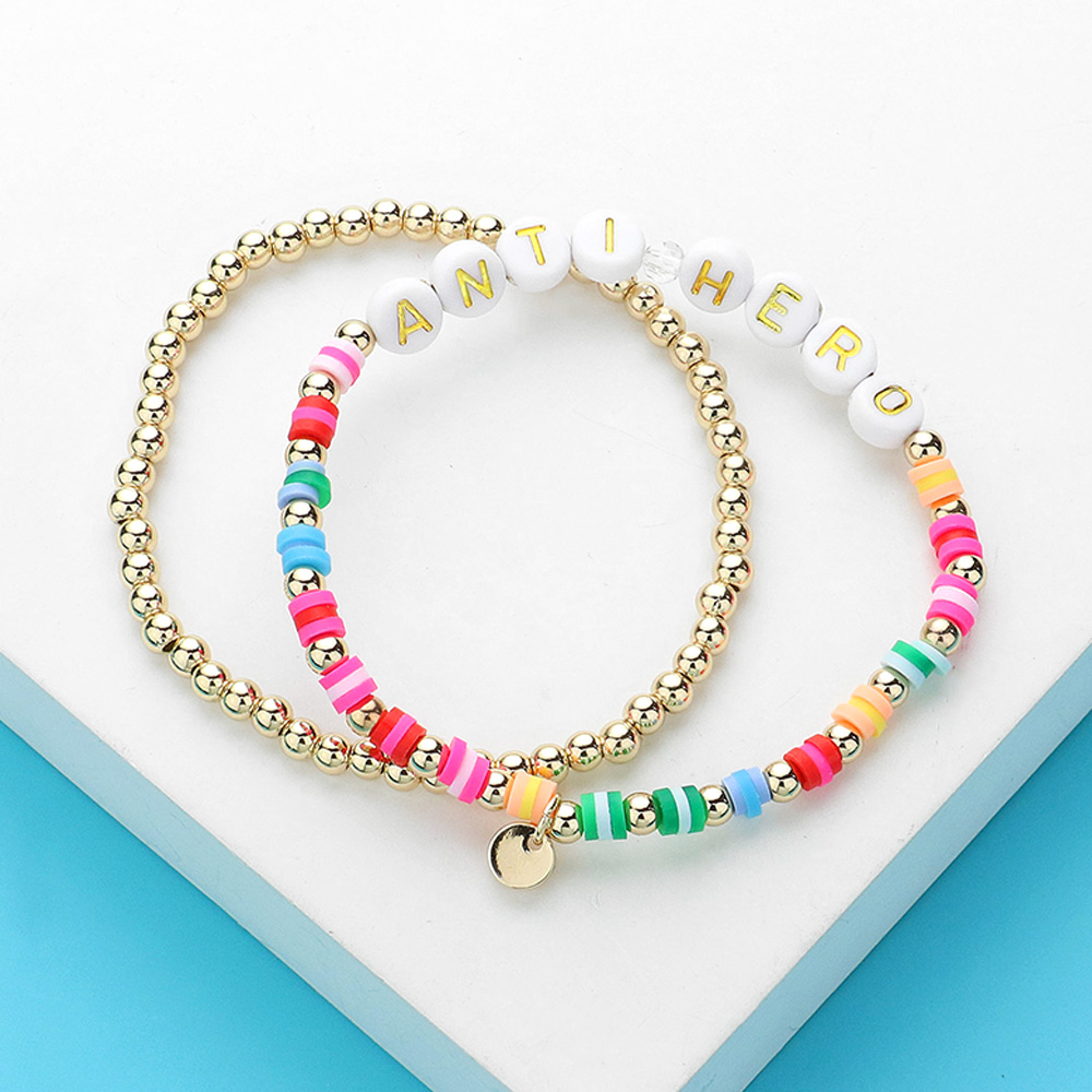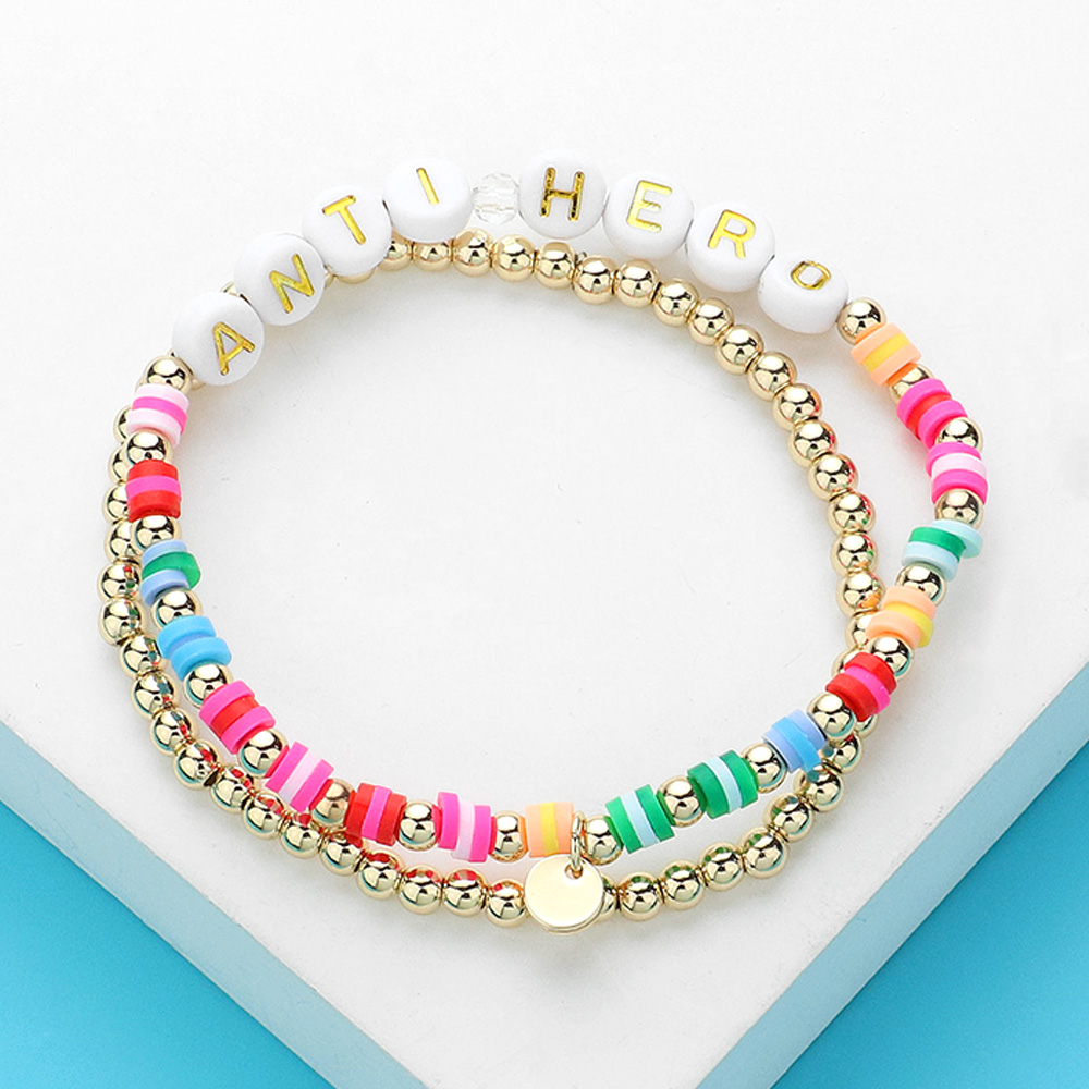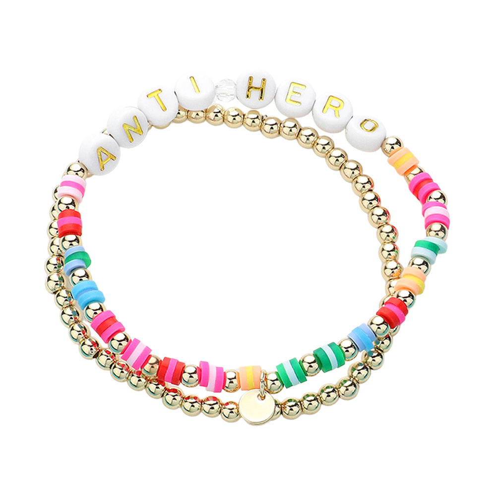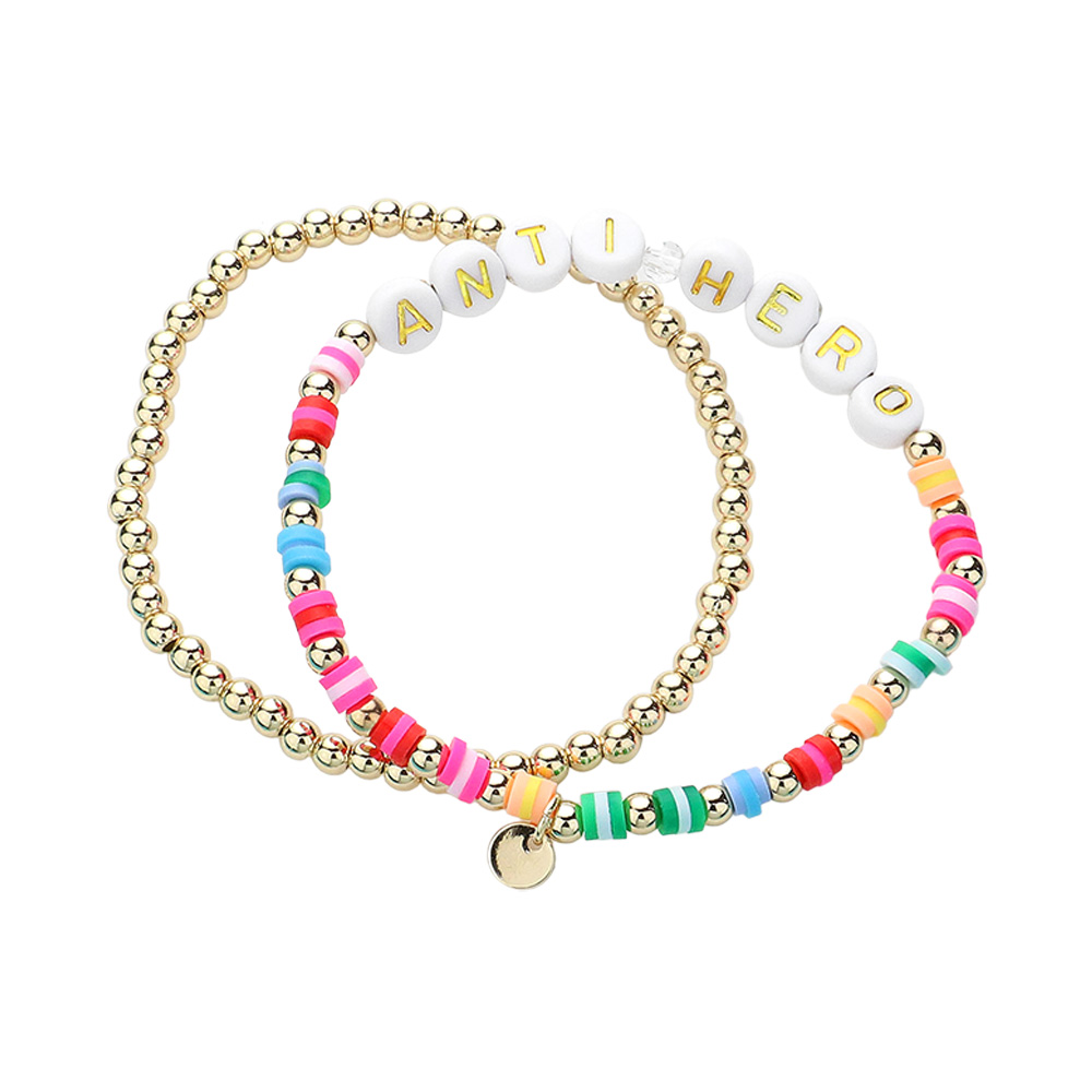 2PCS - ANTI HERO Message Metal Ball Heishi Beaded Stretch Multi Layered Bracelets